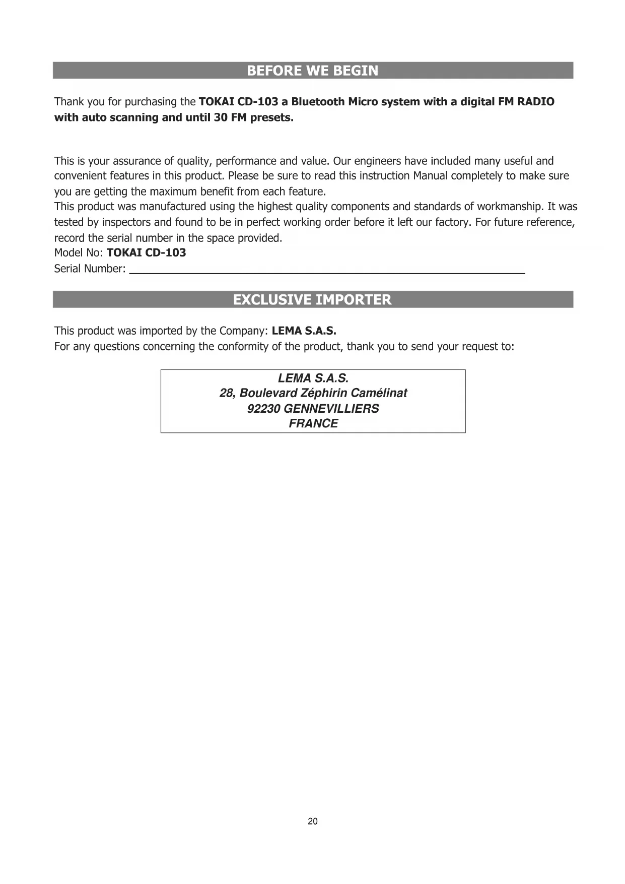 Thank you for purchasing the TOKAI CD-103 a Bluetooth Micro system with a digital FM RADIO with auto scanning and until 30 FM presets. This is your assurance of quality, performance and value. Our engineers have included many useful and convenient features in this product. Please be sure to read this instruction Manual completely to make sure you are getting the maximum benefit from each feature. This product was manufactured using the highest quality components and standards of workmanship. It was tested by inspectors and found to be in perfect working order before it left our factory. For future reference, record the serial number in the space provided. Model No: TOKAI CD-103 Serial Number: _________________________________________________________ EXCLUSIVE IMPORTER This product was imported by the Company: LEMA S.A.S. For any questions concerning the conformity of the product, thank you to send your request to: LEMA S.A.S. 28, Boulevard Zéphirin Camélinat 92230 GENNEVILLIERS FRANCE21 WARNINGS TO PREVENT FIRE OR SHOCK HAZARD DO NOT EXPOSE THIS APPLIANCE TO RAIN OR MOISTURE.