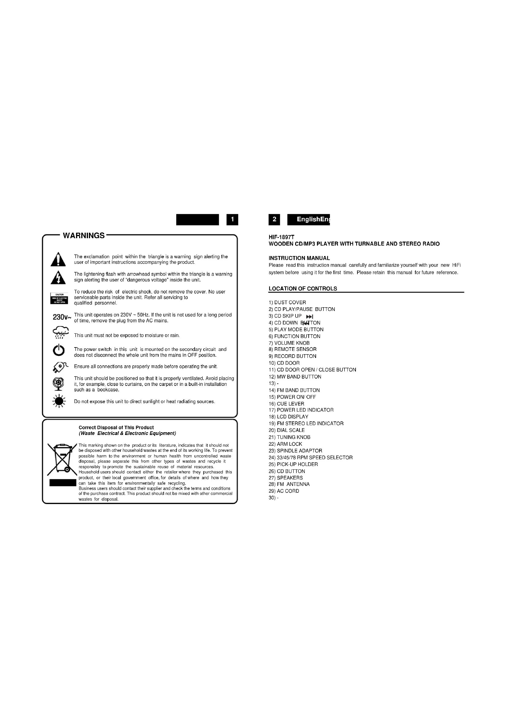 WARNINGS The exclamation point within the triangle is a warning sign alerting the user of important instructions accompanying the product. The lightening flash with arrowhead symbol within the triangle is a warning sign alerting the user of “dangerous voltage” inside the unit. To reduce the risk of electric shock, do not remove the cover. No user serviceable parts inside the unit. Refer all servicing to qualified personnel. This unit operates on 230V ~ 50Hz. If the unit is not used for a long period of time, remove the plug from the AC mains. This unit must not be exposed to moisture or rain. The power switch in this unit is mounted on the secondary circuit and does not disconnect the whole unit from the mains in OFF position. Ensure all connections are properly made before operating the unit. This unit should be positioned so that it is properly ventilated. Avoid placing it, for example, close to curtains, on the carpet or in a built-in installation such as a bookcase. Do not expose this unit to direct sunlight or heat radiating sources. HIF-1897T WOODEN CD/MP3 PLAYER WITH TURNABLE AND STEREO RADIO INSTRUCTION MANUAL Please read this instruction manual carefully and familiarize yourself with your new HiFi system before using it for the first time. Please retain this manual for future reference.