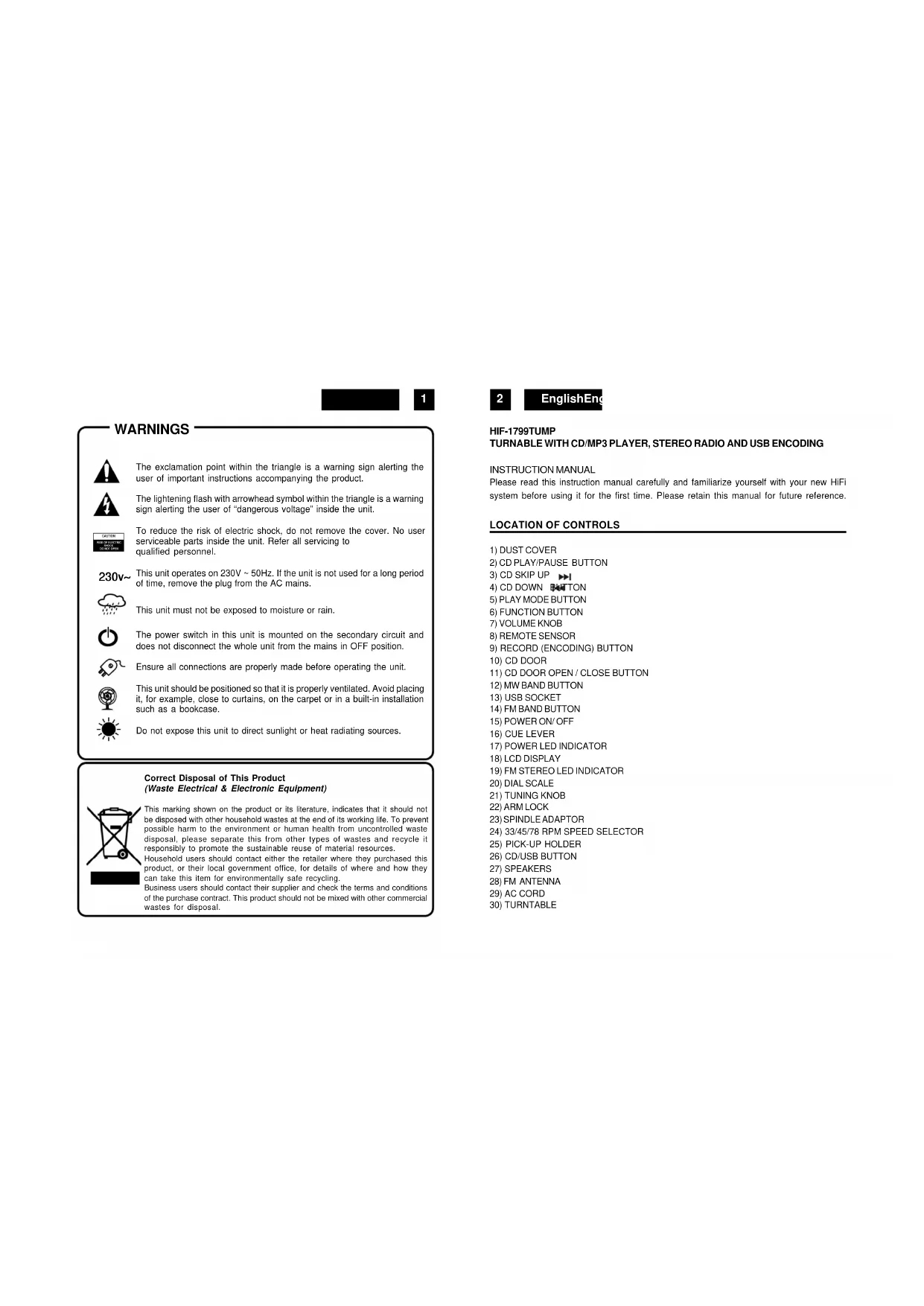 230v~ HIF-1799TUMP TURNABLE WITH CD/MP3 PLAYER, STEREO RADIO AND USB ENCODING INSTRUCTION MANUAL Please read this instruction manual carefully and familiarize yourself with your new HiFi system before using it for the first time. Please retain this manual for future reference.