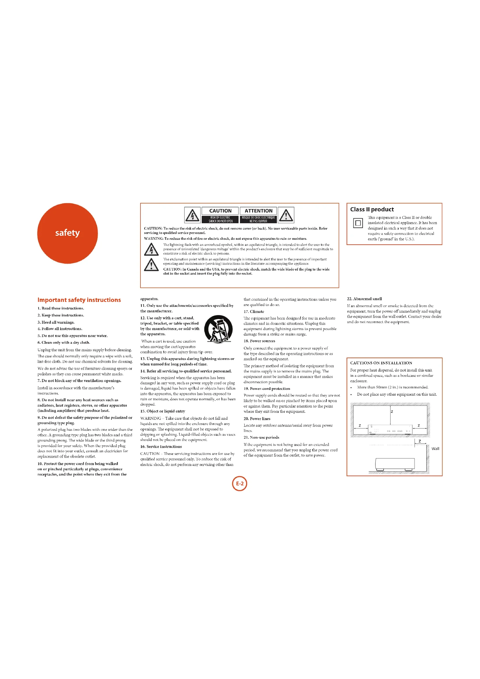 CAUTION: To reduce the risk of electric shock, do not remove cover (or back). No user serviceable parts inside. Refer servicing to qualied service personnel.WARNING: To reduce the risk of re or electric shock, do not expose this apparatus to rain or moisture.e lightning ash with an arrowhead symbol, within an equilateral triangle, is intended to alert the user to the presence of uninsulated ‘dangerous voltage’ within the product’s enclosure that may be of sucient magnitude to constitute a risk of electric shock to persons.e exclamation point within an equilateral triangle is intended to alert the user to the presence of important operating and maintenance (servicing) instructions in the literature accompanying the appliance.CAUTION: In Canada and the USA, to prevent electric shock, match the wide blade of the plug to the wide slot in the socket and insert the plug fully into the socket. Class II product is equipment is a Class II or double insulated electrical appliance. It has been designed in such a way that it does not require a safety connection to electrical earth (‘ground’ in the U.S.).