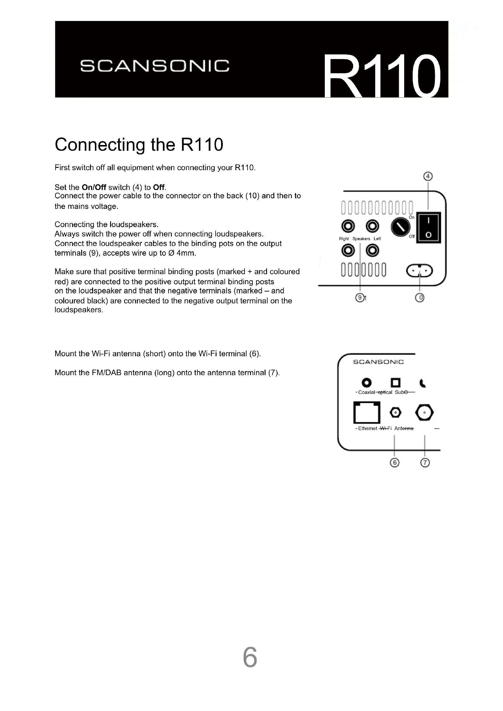 Off Connecting the R110 First switch off all equipment when connecting your R110. Set the On/Off switch (4) to Off. Connect the power cable to the connector on the back (10) and then to the mains voltage. Connecting the loudspeakers. Always switch the power off when connecting loudspeakers. Connect the loudspeaker cables to the binding pots on the output terminals (9), accepts wire up to Ø 4mm. Make sure that positive terminal binding posts (marked + and coloured red) are connected to the positive output terminal binding posts on the loudspeaker and that the negative terminals (marked – and coloured black) are connected to the negative output terminal on the loudspeakers. Mount the Wi-Fi antenna (short) onto the Wi-Fi terminal (6). Mount the FM/DAB antenna (long) onto the antenna terminal (7).R110