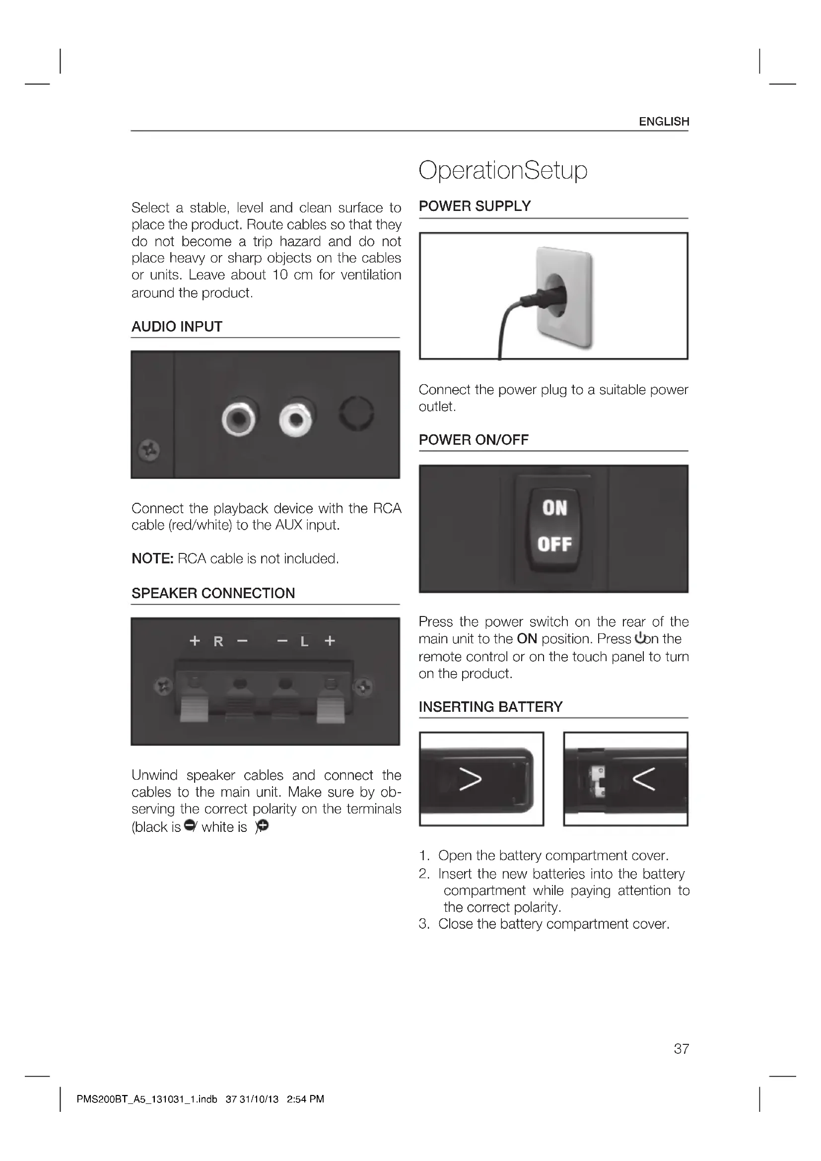 Equalizer Change to mono/stereo Turn o the sound Open/close CD tray Turn on/standby PMS200BT_A5_131031_1.indb 36 31/10/13 2:54 PM37 ENGLISH OperationSetup Select a stable, level and clean surface to place the product. Route cables so that they do not become a trip hazard and do not place heavy or sharp objects on the cables or units. Leave about 10 cm for ventilation around the product. AUDIO INPUT Connect the playback device with the RCA cable (red/white) to the AUX input. NOTE: RCA cable is not included. SPEAKER CONNECTION R L Unwind speaker cables and connect the cables to the main unit. Make sure by ob- serving the correct polarity on the terminals (blackis /whiteis ). POWER SUPPLY Connect the power plug to a suitable power outlet.