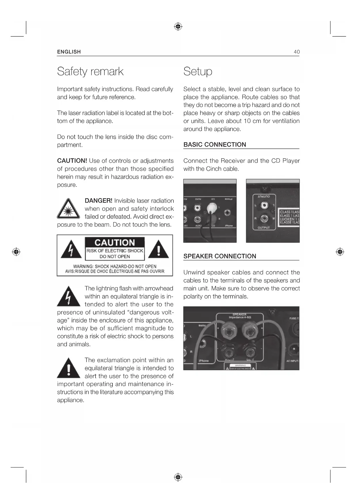 Safety remark The lightning flash with arrowhead within an equilateral triangle is in- tended to alert the user to the presence of uninsulated “dangerous volt- age” inside the enclosure of this appliance, which may be of sufficient magnitude to constitute a risk of electric shock to persons and animals. The exclamation point within an equilateral triangle is intended to alert the user to the presence of important operating and maintenance in- structions in the literature accompanying this appliance. Important safety instructions. Read carefully and keep for future reference. The laser radiation label is located at the bot- tom of the appliance. Do not touch the lens inside the disc com- partment. CAUTION! Use of controls or adjustments of procedures other than those specified herein may result in hazardous radiation ex- posure. DANGER! Invisible laser radiation when open and safety interlock failed or defeated. Avoid direct ex- posure to the beam. Do not touch the lens. Setup Select a stable, level and clean surface to place the appliance. Route cables so that they do not become a trip hazard and do not place heavy or sharp objects on the cables or units. Leave about 10 cm for ventilation around the appliance. BASIC CONNECTION Connect the Receiver and the CD Player with the Cinch cable. SPEAKER CONNECTION Unwind speaker cables and connect the cables to the terminals of the speakers and main unit. Make sure to observe the correct polarity on the terminals.ENGLISH
