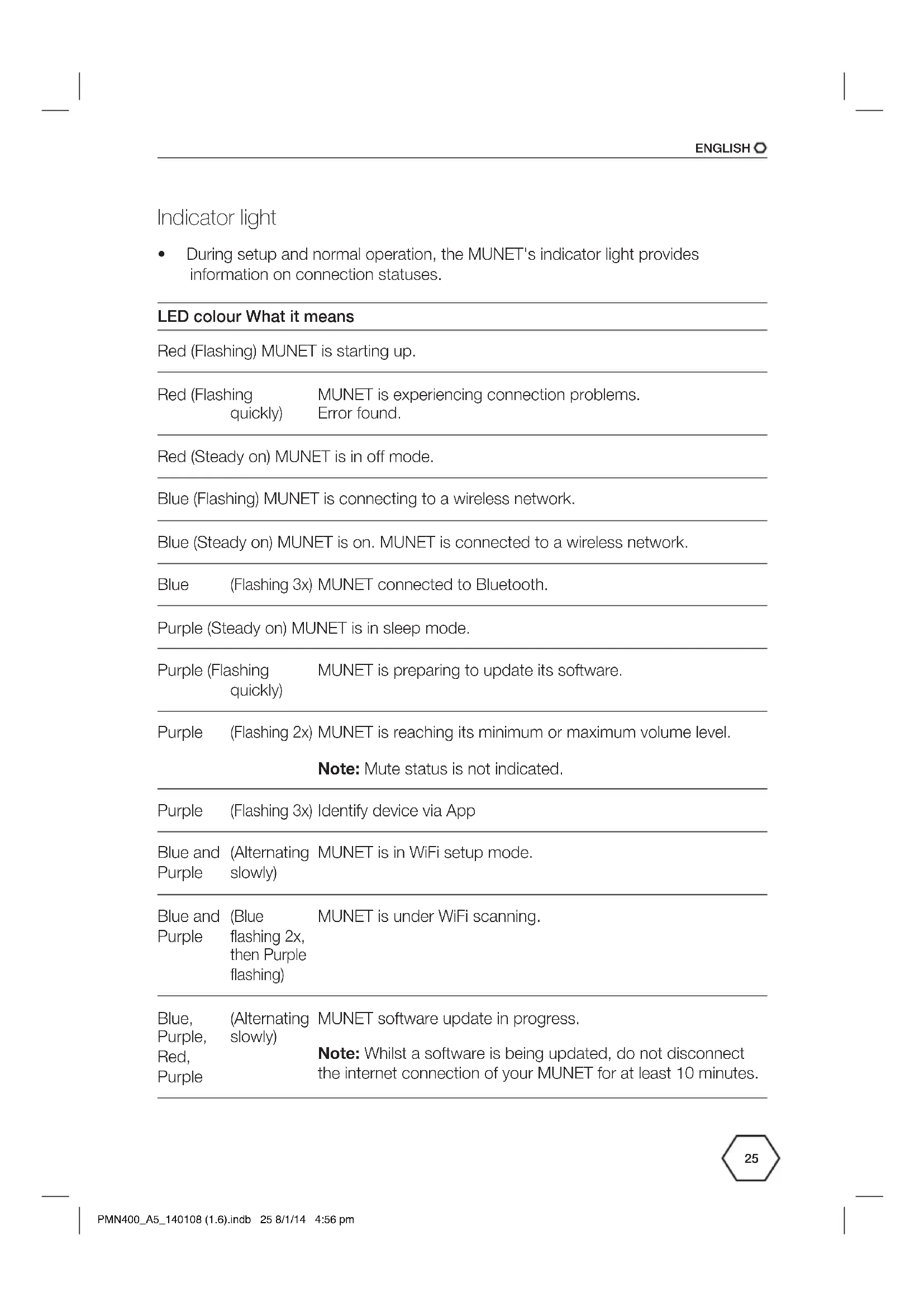 - During setup and normal operation, the MUNET's indicator light provides information on connection statuses. LED colour What it means Red (Flashing) MUNET is starting up. Red (Flashing quickly) MUNET is experiencing connection problems. Error found. Red (Steady on) MUNET is in off mode. Blue (Flashing) MUNET is connecting to a wireless network. Blue (Steady on) MUNET is on. MUNET is connected to a wireless network. Blue (Flashing 3x) MUNET connected to Bluetooth. Purple (Steady on) MUNET is in sleep mode. Purple (Flashing quickly) MUNET is preparing to update its software. Purple (Flashing 2x) MUNET is reaching its minimum or maximum volume level. Note: Mute status is not indicated. Purple (Flashing 3x) Identify device via App Blue and Purple (Alternating slowly) MUNET is in WiFi setup mode. Blue and Purple (Blue flashing 2x, then Purple flashing) MUNET is under WiFi scanning. Blue, Purple, Red, Purple (Alternating slowly) MUNET software update in progress. Note: Whilst a software is being updated, do not disconnect the internet connection of your MUNET for at least 10 minutes. PMN400_A5_140108 (1.6).indb 25 8/1/14 4:56 pmENGLISH