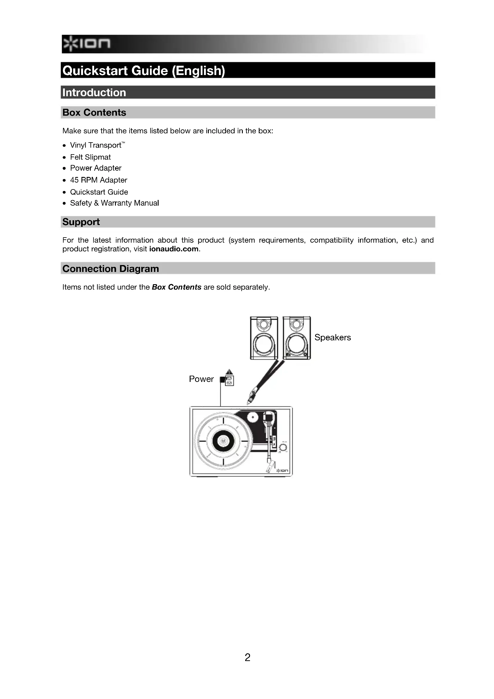- Safety & Warranty Manual Support For the latest information about this product (system requirements, compatibility information, etc.) and product registration, visit ionaudio.com. Connection Diagram Items not listed under the Box Contents are sold separately.
