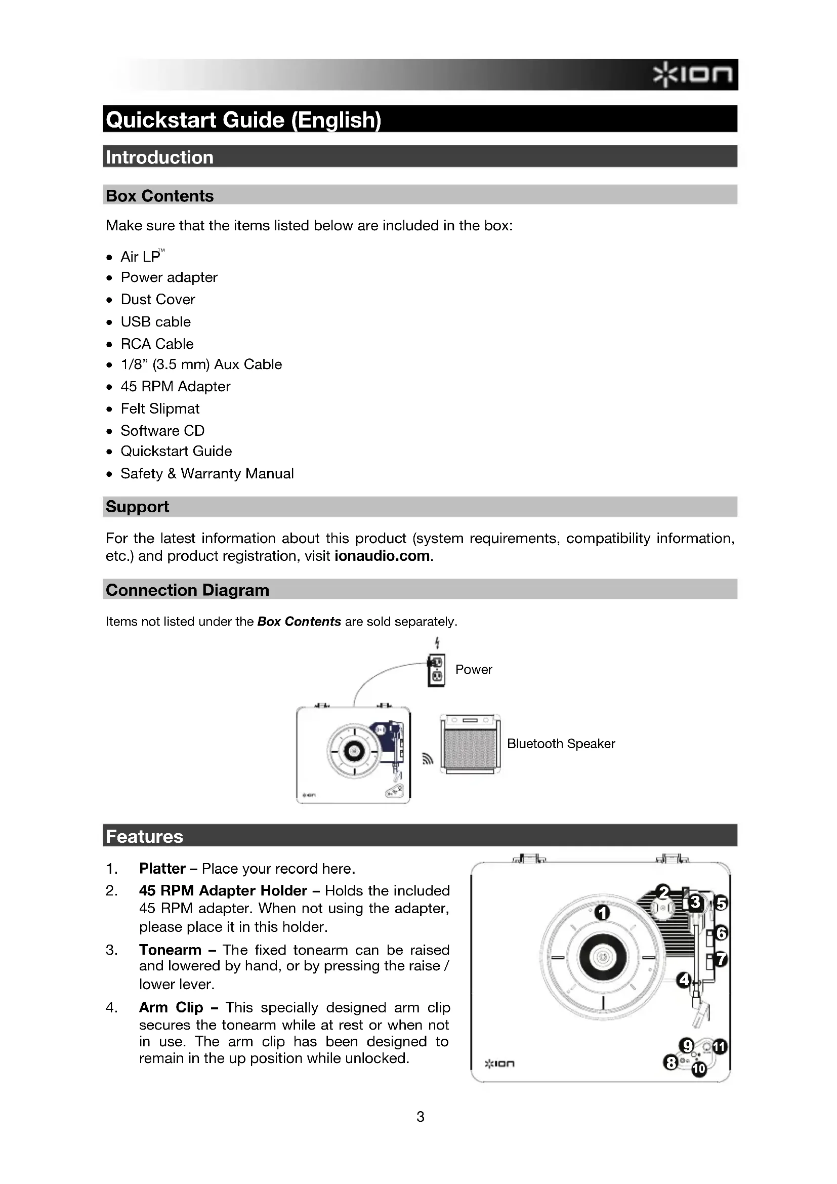 - Safety & Warranty Manual Support For the latest information about this product (system requirements, compatibility information, etc.) and product registration, visit ionaudio.com. Connection Diagram Items not listed under the Box Contents are sold separately.