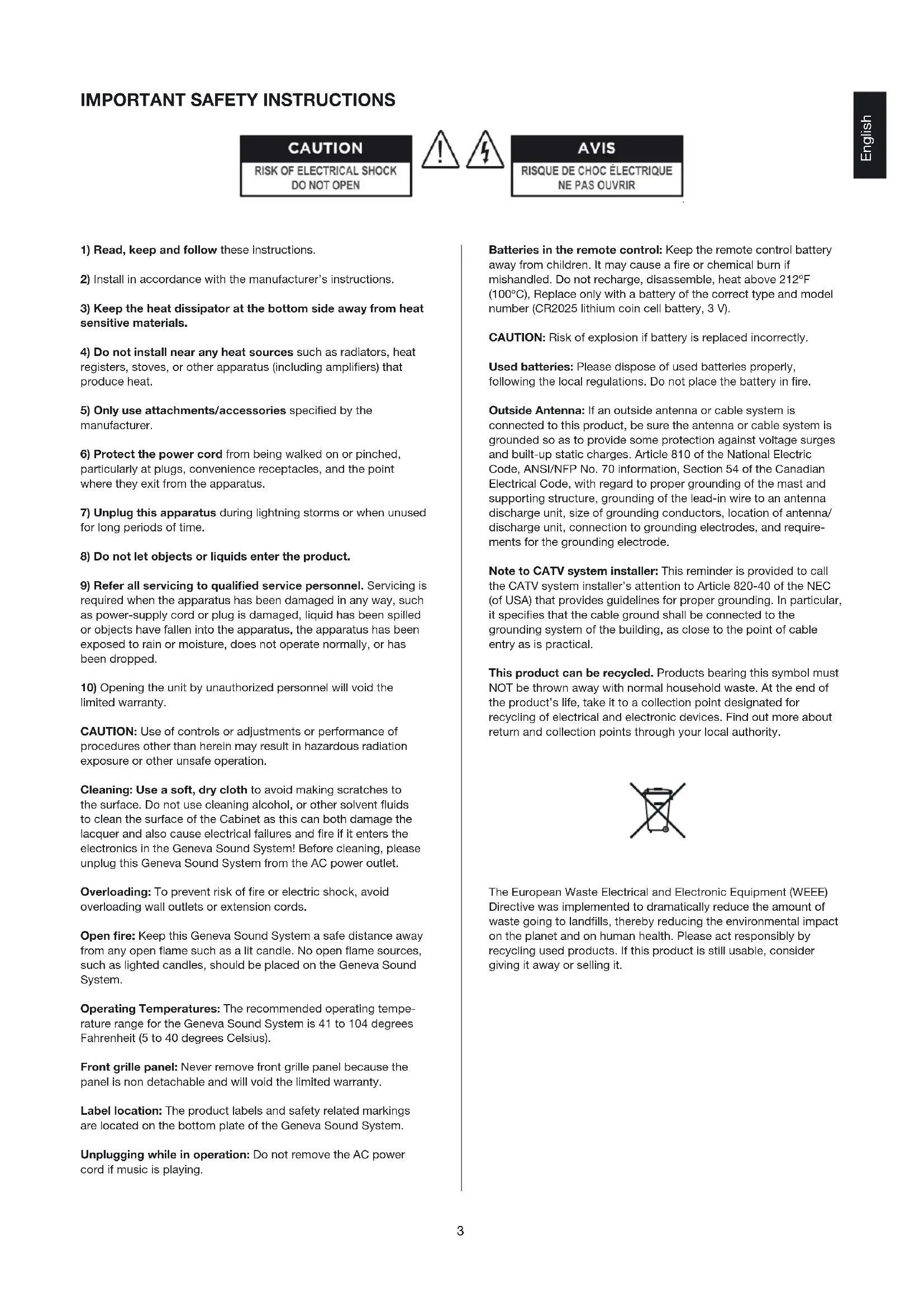 limited warranty. CAUTION: Use of controls or adjustments or performance of procedures other than herein may result in hazardous radiation exposure or other unsafe operation. Cleaning: Use a soft, dry cloth to avoid making scratches to the surface. Do not use cleaning alcohol, or other solvent fluids to clean the surface of the Cabinet as this can both damage the lacquer and also cause electrical failures and fire if it enters the electronics in the Geneva Sound System! Before cleaning, please unplug this Geneva Sound System from the AC power outlet. Overloading: To prevent risk of fire or electric shock, avoid overloading wall outlets or extension cords. Open fire: Keep this Geneva Sound System a safe distance away from any open flame such as a lit candle. No open flame sources, such as lighted candles, should be placed on the Geneva Sound System. Operating Temperatures: The recommended operating tempe- rature range for the Geneva Sound System is 41 to 104 degrees Fahrenheit (5 to 40 degrees Celsius). Front grille panel: Never remove front grille panel because the panel is non detachable and will void the limited warranty. Label location: The product labels and safety related markings are located on the bottom plate of the Geneva Sound System. Unplugging while in operation: Do not remove the AC power cord if music is playing. English4