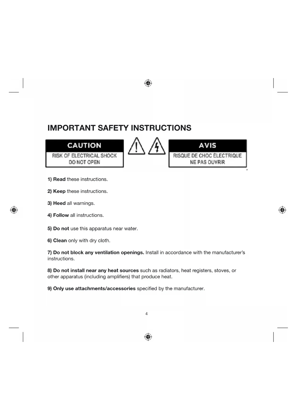 12) Refer all servicing to qualified service personnel. Servicing is required when the apparatus has been damaged in any way, such as power-supply cord or plug is damaged, liquid has been spilled or objects have fallen into the apparatus, the apparatus has been exposed to rain or moisture, does not operate normally, or has been dropped.