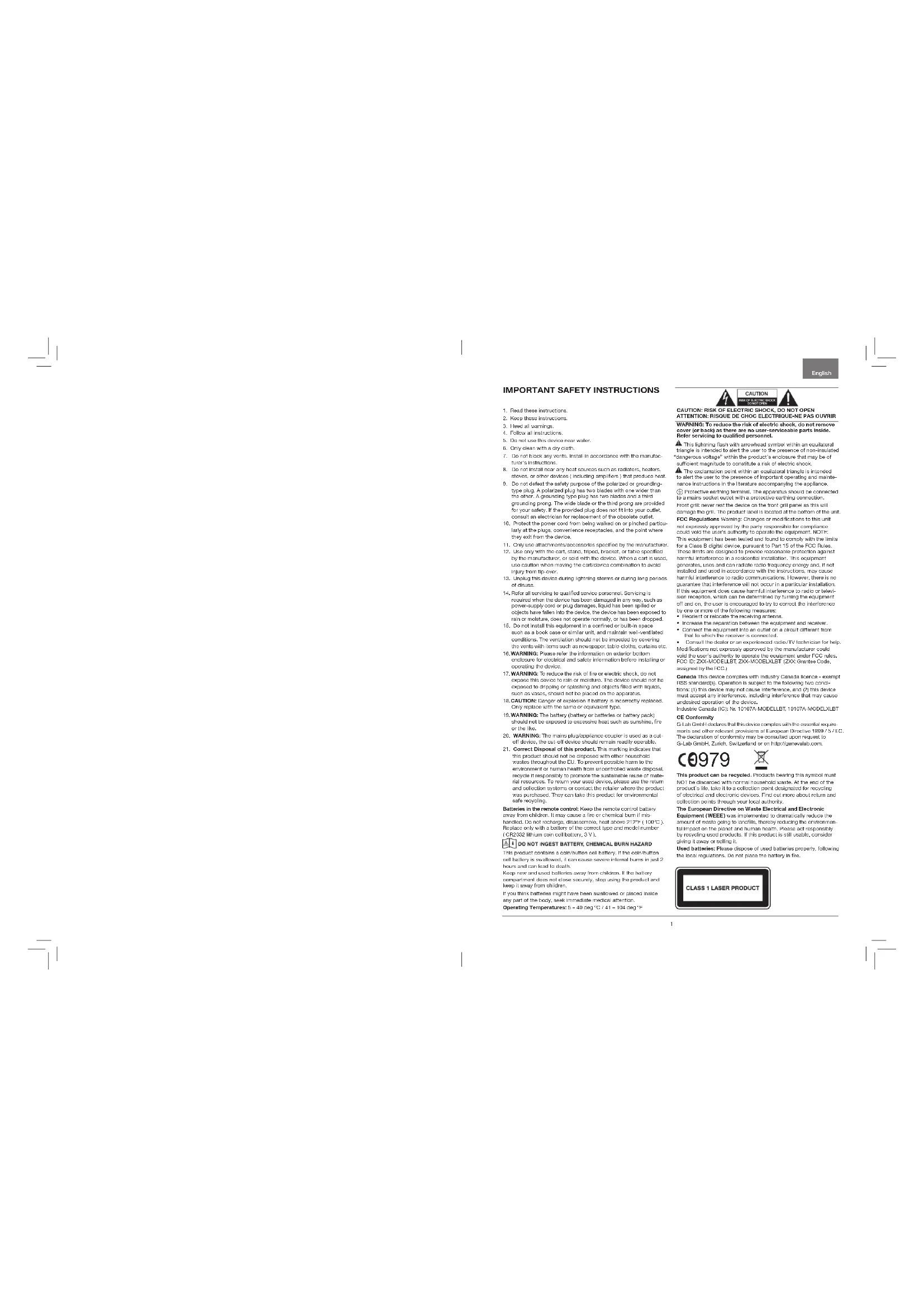 1. Read these instructions.2. Keep these instructions.3. Heed all warnings.4. Follow all instructions.5. Do not use this device near water.6. Only clean with a dry cloth.7. Do not block any vents. Install in accordance with the manufac-turer’s instructions.8. Do not install near any heat sources such as radiators, heaters, stoves, or other devices ( including ampliers ) that produce heat. 9. Do not defeat the safety purpose of the polarized or grounding-type plug. A polarized plug has two blades with one wider than the other. A grounding type plug has two blades and a third grounding prong. The wide blade or the third prong are provided for your safety. If the provided plug does not t into your outlet, consult an electrician for replacement of the obsolete outlet.10. Protect the power cord from being walked on or pinched particu-larly at the plugs, convenience receptacles, and the point where they exit from the device.11. Only use attachments/accessories specied by the manufacturer.12. Use only with the cart, stand, tripod, bracket, or table specied by the manufacturer, or sold with the device. When a cart is used, use caution when moving the cart/device combination to avoid injury from tip-over.13. Unplug this device during lightning storms or during long periods of disuse.14. Refer all servicing to qualied service personnel. Servicing is required when the device has been damaged in any way, such as power-supply cord or plug damages, liquid has been spilled or objects have fallen into the device, the device has been exposed to rain or moisture, does not operate normally, or has been dropped.15. Do not install this equipment in a conned or built-in space such as a book case or similar unit, and maintain well-ventilated conditions. The ventilation should not be impeded by covering the vents with items such as newspaper, table-cloths, curtains etc.