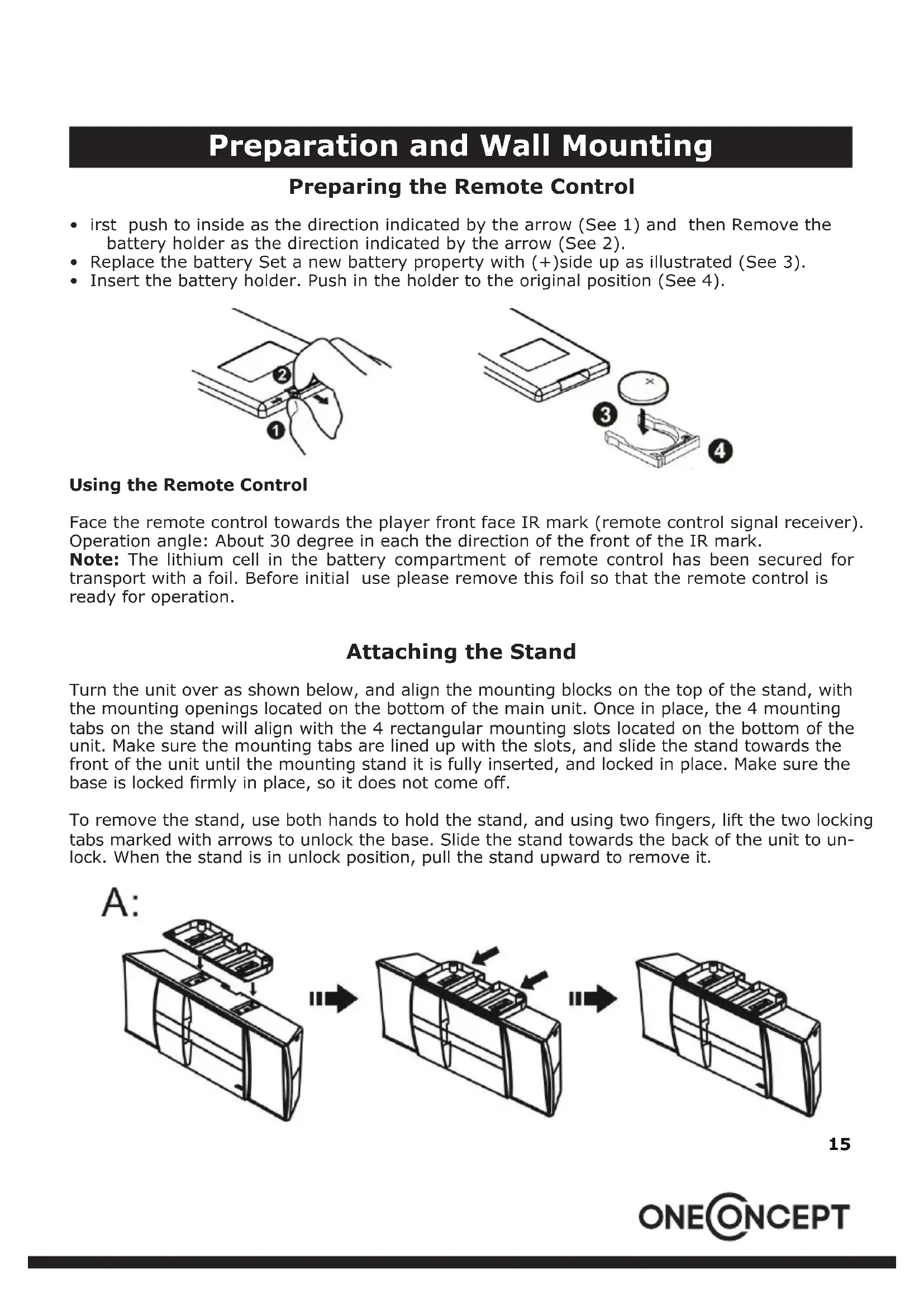 - Insert the battery holder. Push in the holder to the original position (See 4). Using the Remote Control Face the remote control towards the player front face IR mark (remote control signal receiver). Operation angle: About 30 degree in each the direction of the front of the IR mark. Note: The lithium cell in the battery compartment of remote control has been secured for transport with a foil. Before initial use please remove this foil so that the remote control is ready for operation. Attaching the Stand Turn the unit over as shown below, and align the mounting blocks on the top of the stand, with the mounting openings located on the bottom of the main unit. Once in place, the 4 mounting tabs on the stand will align with the 4 rectangular mounting slots located on the bottom of the unit. Make sure the mounting tabs are lined up with the slots, and slide the stand towards the front of the unit until the mounting stand it is fully inserted, and locked in place. Make sure the base is locked rmly in place, so it does not come o. To remove the stand, use both hands to hold the stand, and using two ngers, lift the two locking tabs marked with arrows to unlock the base. Slide the stand towards the back of the unit to un- lock. When the stand is in unlock position, pull the stand upward to remove it.16 Wall Mounting