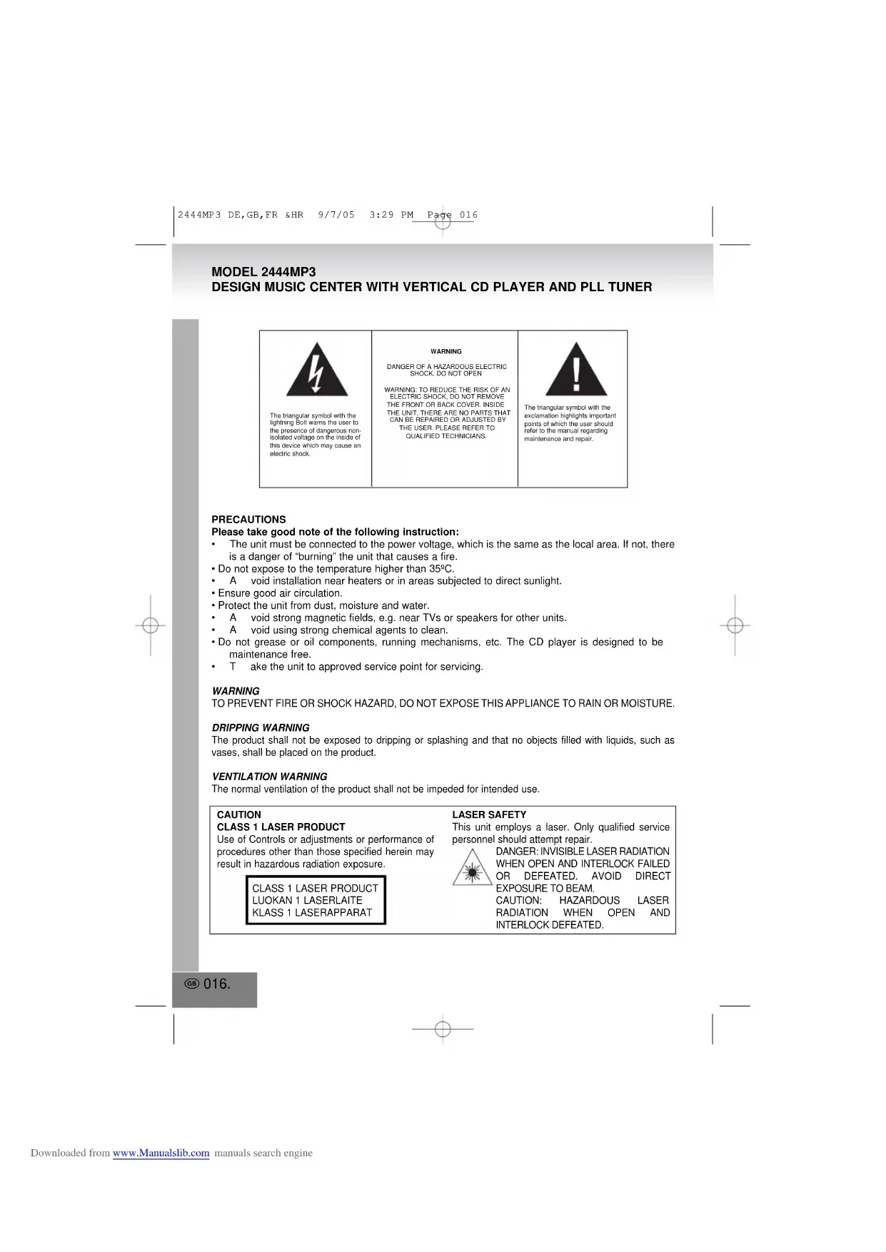- The unit must be connected to the power voltage, which is the same as the local area. If not, there is a danger of “burning” the unit that causes a fire.• Do not expose to the temperature higher than 35ºC.•Avoid installation near heaters or in areas subjected to direct sunlight.• Ensure good air circulation.• Protect the unit from dust, moisture and water.•Avoid strong magnetic fields, e.g. near TVs or speakers for other units.•Avoid using strong chemical agents to clean.• Do not grease or oil components, running mechanisms, etc. The CD player is designed to bemaintenance free.•Take the unit to approved service point for servicing.WARNING TO PREVENT FIRE OR SHOCK HAZARD, DO NOT EXPOSE THIS APPLIANCE TO RAIN OR MOISTURE. DRIPPING WARNINGThe product shall not be exposed to dripping or splashing and that no objects filled with liquids, such asvases, shall be placed on the product.VENTILATION WARNINGThe normal ventilation of the product shall not be impeded for intended use. The triangular symbol with thelightning Bolt warns the user tothe presence of dangerous non-isolated voltage on the inside ofthis device which may cause anelectric shock.WARNINGDANGER OF A HAZARDOUS ELECTRICSHOCK. DO NOT OPENWARNING: TO REDUCE THE RISK OF ANELECTRIC SHOCK, DO NOT REMOVETHE FRONT OR BACK COVER. INSIDETHE UNIT, THERE ARE NO PARTS THATCAN BE REPAIRED OR ADJUSTED BYTHE USER. PLEASE REFER TOQUALIFIED TECHNICIANS.The triangular symbol with theexclamation highlights importantpoints of which the user shouldrefer to the manual regardingmaintenance and repair. MODEL 2444MP3 DESIGN MUSIC CENTER WITH VERTICAL CD PLAYER AND PLL TUNER CAUTIONCLASS 1 LASER PRODUCTUse of Controls or adjustments or performance ofprocedures other than those specified herein mayresult in hazardous radiation exposure.CLASS 1 LASER PRODUCTLUOKAN 1 LASERLAITEKLASS 1 LASERAPPARATLASER SAFETYThis unit employs a laser. Only qualified servicepersonnel should attempt repair.DANGER: INVISIBLE LASER RADIATIONWHEN OPEN AND INTERLOCK FAILEDOR DEFEATED. AVOID DIRECTEXPOSURE TO BEAM.CAUTION: HAZARDOUS LASERRADIATION WHEN OPEN ANDINTERLOCK DEFEATED. 2444MP3 DE,GB,FR &HR 9/7/05 3:29 PM Page 016 Downloaded from www.Manualslib.com manuals search engine 017. WARNING Read the instruction manual before you attempt to use the unit. Handle glass panels with care. Consult your dealer or service personnel if you have questions about the installation, operation or safety of the unit. Make sure unit is plugged into a 230V outlet. Using higher voltage outlets could cause the unit to malfunction or catch fire. Make sure all electrical connections (including extensions and inter connectors) are properly made. Turn unit off before unplugging it from power source. Do not expose to temperatures above 35 ºC. Do not place unit near heaters or in areas subjected to direct sunlight. Place unit where there is good air circulation. Protect unit from dust, moisture, water and other liquids. Do not place unit near TVs, speakers and other objects that generate strong magnetic fields. Do not clean with strong chemical agents. Do not grease or oil components, running mechanisms, etc. CD player is designed to be maintenance- free. Do not attempt to service this unit yourself. Take to an approved service center if repairs are necessary. Do not operate unit if it is not working normally or has been damaged in any way. Turn unit off, unplug it from the power source and consult service personnel. Do not remove any fixed cover. This will increase the chance of electrical shock. Do not leave unit unattended when in use. Do not listen to headphones at high volumes. Do not obstruct vents on unit. Do not attempt to create your own stand for the unit. Use only the included stand. Do not push object into any holes, slots or openings on unit. Do not allow children to operate unit without adult supervision. Erratic performance may occur if unit is used in rooms lit with fluorescent lights. CAUTION - This CD player may be used only with the captioned manufacturer's stand. Use with other stand may result in instability causing possible injury. Above all