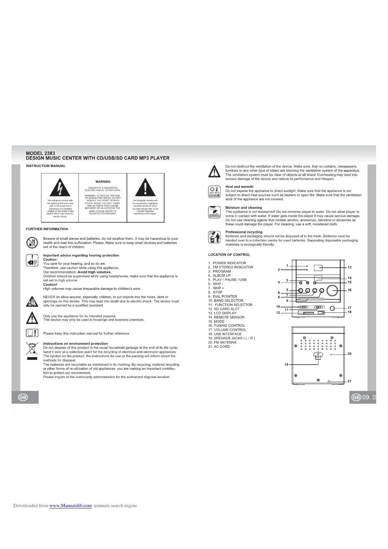 FURTHER INFORMATIONThe triangular symbol with the lightning Bolt warns the user to the presence of dangerous non-isolated voltage on the inside of this device which may cause an electric shock.The triangular symbol with the exclamation highlights important points of which the user should refer to the manual regarding maintenance and repair.WARNINGDANGER OF A HAZARDOUS ELECTRIC SHOCK. DO NOT OPENWARNING: TO REDUCE THE RISK OF AN ELECTRIC SHOCK, DO NOT REMOVE THE FRONT OR BACK COVER. INSIDE THE UNIT, THERE ARE NO PARTS THAT CAN BE REPAIRED OR ADJUSTED BY THE USER. PLEASE REFER TO QUALIFIED TECHNICIANS.Please keep this instruction manual for further referenceDo not obstruct the ventilation of the device. Make sure, that no curtains, newspapers, furniture or any other type of object are blocking the ventilation system of the apparatus. The ventilation system must be clear of objects at all times! Overheating may lead into serious damage of the device and reduce its performance and lifespan.Heat and warmthDo not expose the appliance to direct sunlight. Make sure that the appliance is not subject to direct heat sources such as heaters or open fire. Make sure that the ventilation slots of the appliance are not covered.Moisture and cleaningThis appliance is not waterproof! Do not immerse player in water. Do not allow player to come in contact with water. If water gets inside the player it may cause serious damage. Do not use cleaning agents that contain alcohol, ammoniac, benzene or abrasives as these could damage the player. For cleaning, use a soft, moistened cloth.Instructions on environment protectionDo not dispose of this product in the usual household garbage at the end of its life cycle; hand it over at a collection point for the recycling of electrical and electronic appliances. The symbol on the product, the instructions for use or the packing will inform about the methods for disposal.The materials are recyclable as mentioned in its marking. By recycling, material recycling or other forms of re-utilization of old appliances, you are making an important contribu-tion to protect our environment.Please inquire at the community administration for the authorized disposal location.NEVER let allow anyone, especially children, to put objects into the holes, slots or openings on this devise. This may lead into death due to electric shock. The device must only be opened by a qualified assistant.Beware of small pieces and batteries, do not swallow them. It may be hazardous to your health and lead into suffocation. Please, Make sure to keep small devices and batteries out of the reach of children.Important advice regarding hearing protectionCaution:You care for your hearing, and so do we.Therefore, use caution while using this appliance.Our recommendation: Avoid high volumes.Children should be supervised while using headphones; make sure that the appliance is not set to high volumeCaution!High volumes may cause irreparable damage to children’s ears.Only use the appliance for its intended purpose.This device may only be used in housings and business premises.Professional recyclingBatteries and packaging should not be disposed of in the trash. Batteries must be handed over to a collection centre for used batteries. Separating disposable packaging materials is ecologically friendly.INSTRUCTION MANUAL MODEL 2383 DESIGN MUSIC CENTER WITH CD/USB/SD CARD MP3 PLAYER LOCATION OF CONTROL1. POWER INDICATOR2. FM STEREO INDICATOR3. PROGRAM4. ALBUM UP5. PLAY / PAUSE / USB6. SKIP -7. SKIP +8. STOP9. DIAL POINTER10. BAND SELECTOR11. FUNCTION SELECTOR12. SD CARD SLOT13. LCD DISPLAY14. REMOTE SENSOR15. MODE16. TUNING CONTROL17. VOLUME CONTROL18. USB INTERFACE19. SPEAKER JACKS ( L / R )20. FM ANTENNA21. AC CORD Downloaded from www.Manualslib.com manuals search engine11. 10.