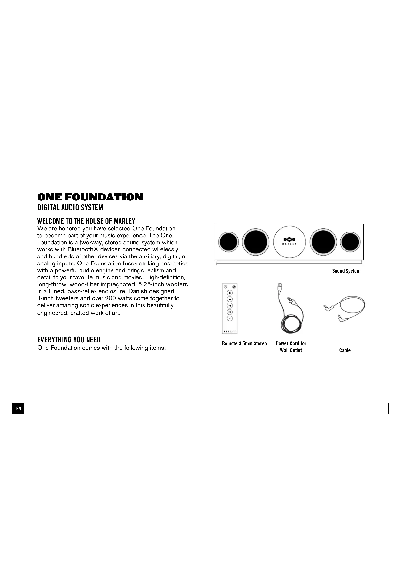 One Foundation comes with the following items: Sound System Remote 3.5mm Stereo Cable Power Cord for Wall Outlet