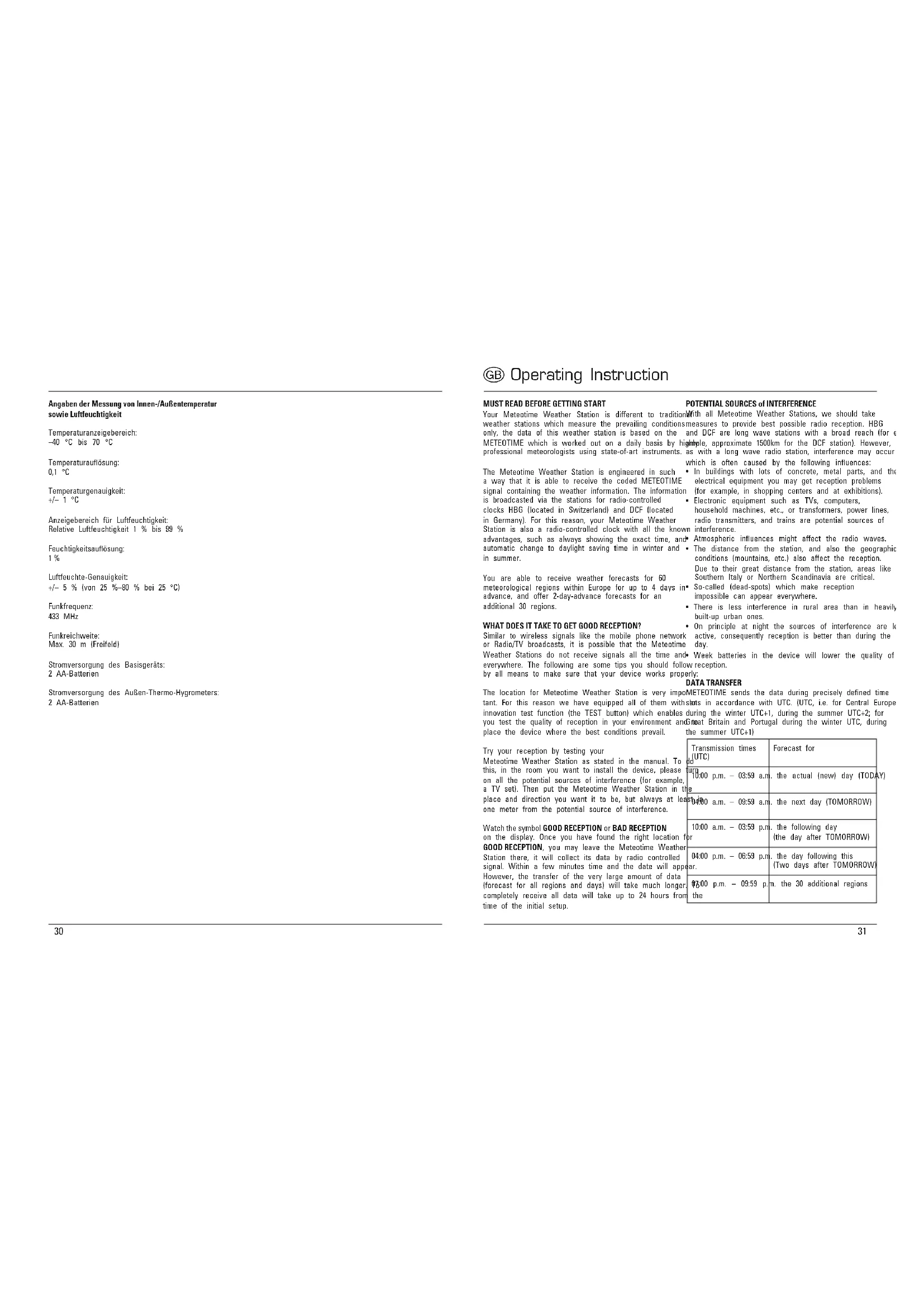 - Week batteries in the device will lower the quality of reception. DATA TRANSFER METEOTIME sends the data during precisely dened time slots in accordance with UTC. (UTC, i.e. for Central Europe during the winter UTC+1, during the summer UTC+2; for Great Britain and Portugal during the winter UTC, during the summer UTC+1)32