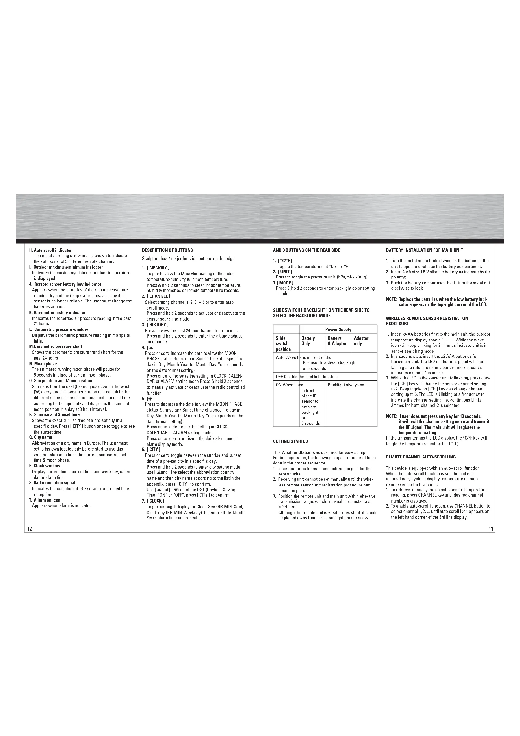 Power Supply Slide switch position Battery Only Battery & Adapter Adapter only Auto Wave hand in front of the IR sensor to activate backlight for 5 seconds OFF Disable the backlight function ON Wave hand in front of the IR sensor to activate backlight for 5 seconds Backlight always on GETTING STARTED This Weather Station was designed for easy set up. For best operation, the following steps are required to be done in the proper sequence.