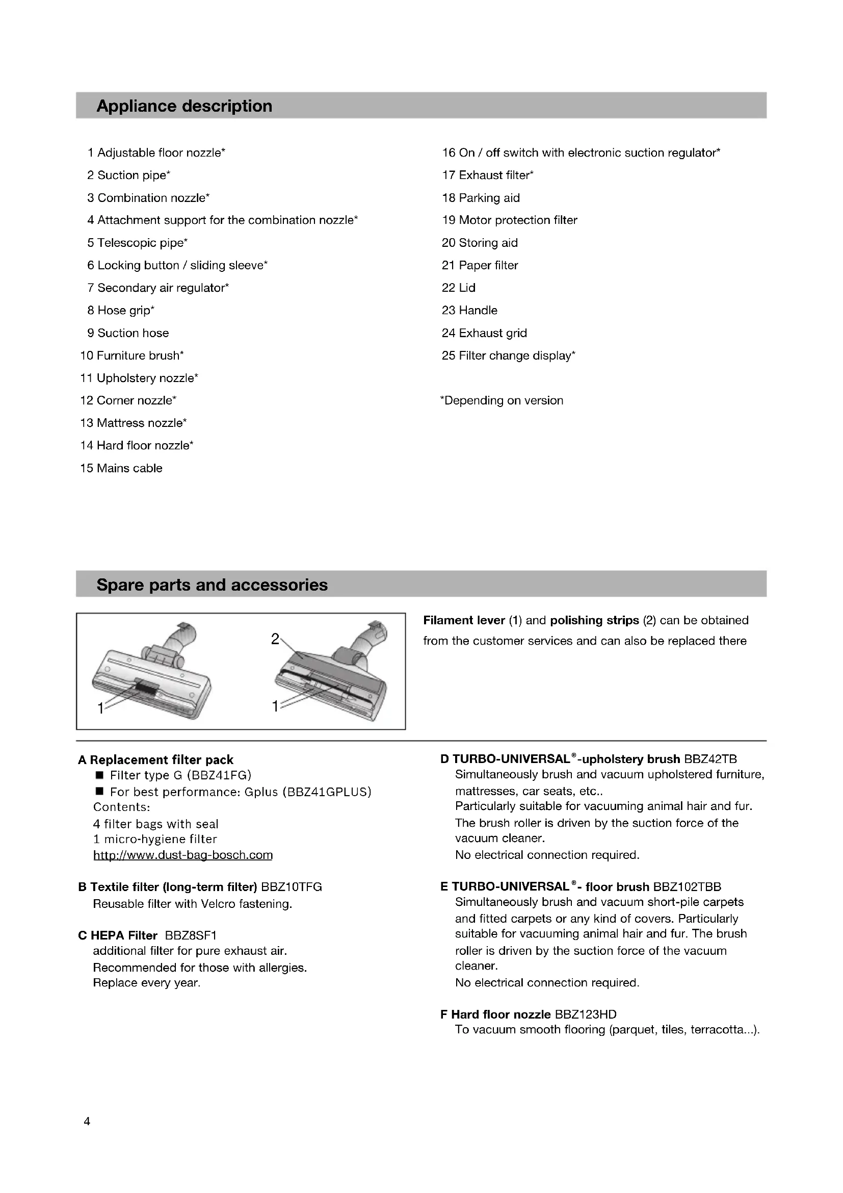 A Replacement filter pack Filter type G (BBZ41FG) For best performance: Gplus (BBZ41GPLUS) Contents: 4 filter bags with seal 1 micro-hygiene filter http:// www.dust-bag-bosch.com B Textile filter (long-term filter) BBZ10TFG Reusable filter with Velcro fastening. C HEPA Filter BBZ8SF1 additional filter for pure exhaust air. Recommended for those with allergies. Replace every year. D TURBO-UNIVERSAL