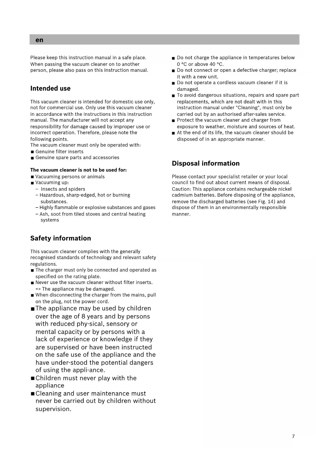 Please keep this instruction manual in a safe place. When passing the vacuum cleaner on to another person, please also pass on this instruction manual. Intended use This vacuum cleaner is intended for domestic use only, not for commercial use. Only use this vacuum cleaner in accordance with the instructions in this instruction manual. The manufacturer will not accept any responsibility for damage caused by improper use or incorrect operation. Therefore, please note the following points. The vacuum cleaner must only be operated with: Genuine filter inserts Genuine spare parts and accessories The vacuum cleaner is not to be used for: Vacuuming persons or animals Vacuuming up: – Insects and spiders – Hazardous, sharp-edged, hot or burning substances. – Highly flammable or explosive substances and gases – Ash, soot from tiled stoves and central heating systems Safety information This vacuum cleaner complies with the generally recognised standards of technology and relevant safety regulations. The charger must only be connected and operated as specified on the rating plate. Never use the vacuum cleaner without filter inserts. => The appliance may be damaged. When disconnecting the charger from the mains, pull on the plug, not the power cord. The appliance may be used by children over the age of 8 years and by persons with reduced phy-sical, sensory or mental capacity or by persons with a lack of experience or knowledge if they are supervised or have been instructed on the safe use of the appliance and the have under-stood the potential dangers of using the appli-ance. Children must never play with the appliance Cleaning and user maintenance must never be carried out by children without supervision. Do not charge the appliance in temperatures below 0 °C or above 40 °C. Do not connect or open a defective charger; replace it with a new unit. Do not operate a cordless vacuum cleaner if it is damaged. To avoid dangerous situations, repairs and spare part replacements, which are not dealt with in this instruction manual under "Cleaning", must only be carried out by an authorised after-sales service. Protect the vacuum cleaner and charger from exposure to weather, moisture and sources of heat. At the end of its life, the vacuum cleaner should be disposed of in an appropriate manner. Disposal information Please contact your specialist retailer or your local council to find out about current means of disposal. Caution: This appliance contains rechargeable nickel cadmium batteries. Before disposing of the appliance, remove the discharged batteries (see Fig. 14) and dispose of them in an environmentally responsible manner. en8 Fold out the picture pages. Before using for the first time Fitting the charger The charger can be wall-mounted or used as a table-top cradle. Figure First connect the charger plug to the charger holder and secure by turning. If using as a table-top cradle, guide the cable through the recess in the charger. Figure When mounting on the wall, select a location close to a socket and mount the charger on the wall using the screws provided Figure Insert the cordless vacuum cleaner into the charger as shown.