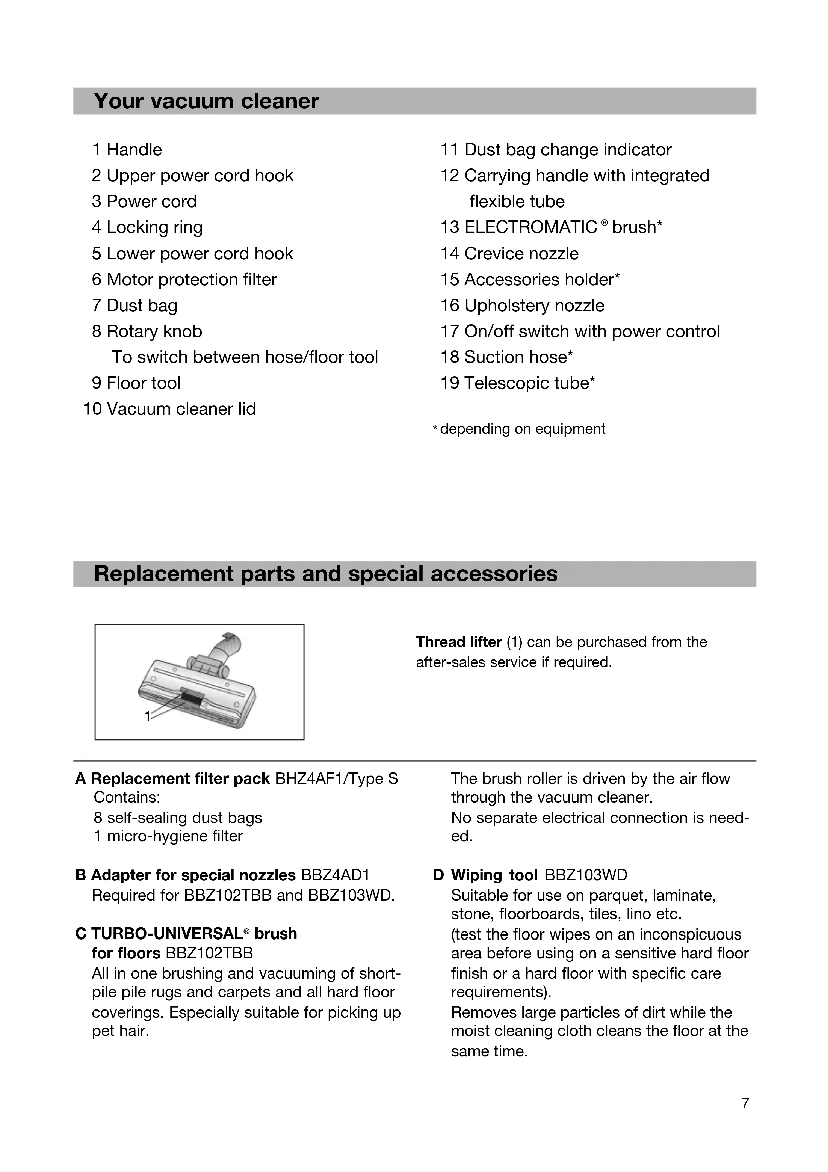 depending on equipment A Replacement filter pack BHZ4AF1/Type S Contains: 8 self-sealing dust bags 1 micro-hygiene filter B Adapter for special nozzles BBZ4AD1 Required for BBZ102TBB and BBZ103WD. C TURBO-UNIVERSAL