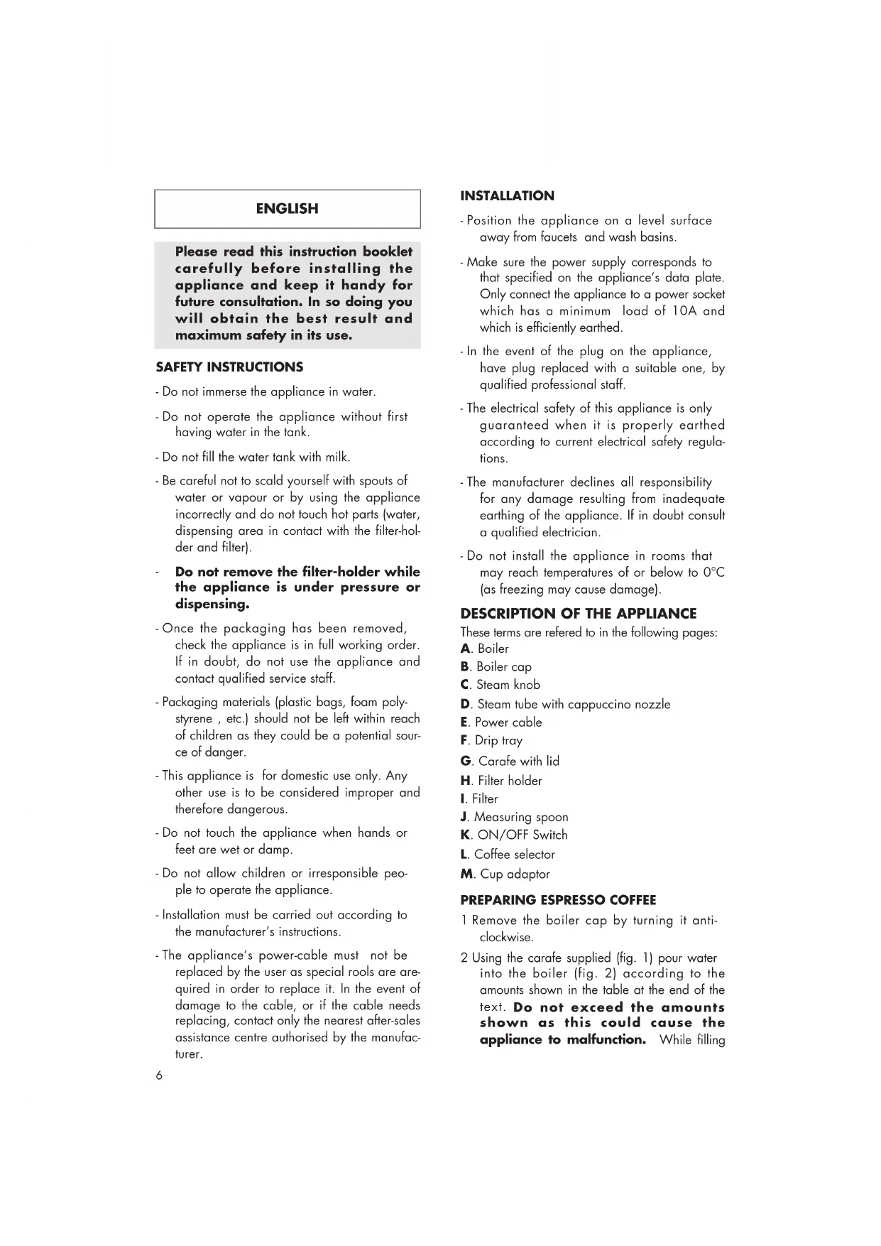 MILK6 Please read this instruction booklet carefully before installing the appliance and keep it handy for future consultation. In so doing you will obtain the best result and maximum safety in its use. SAFETY INSTRUCTIONS - Do not immerse the appliance in water. - Do not operate the appliance without first having water in the tank. - Do not fill the water tank with milk. - Be careful not to scald yourself with spouts of water or vapour or by using the appliance incorrectly and do not touch hot parts (water, dispensing area in contact with the filter-hol- der and filter).