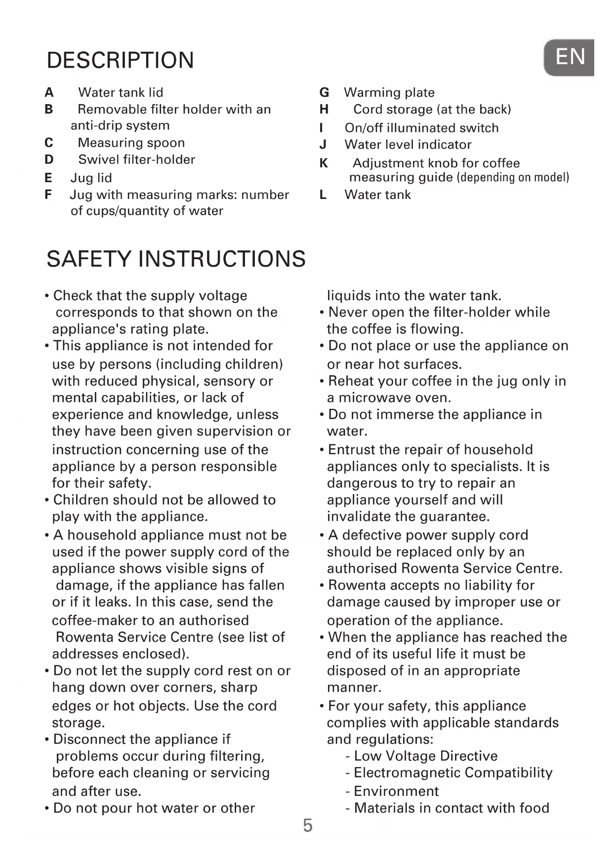 G Warming plate H Cord storage (at the back) I On/off illuminated switch J Water level indicator K Adjustment knob for coffee measuring guide (depending on model) L Water tank A Water tank lid B Removable filter holder with an anti-drip system C Measuring spoon D Swivel filter-holder E Jug lid F Jug with measuring marks: number of cups/quantity of water liquids into the water tank.