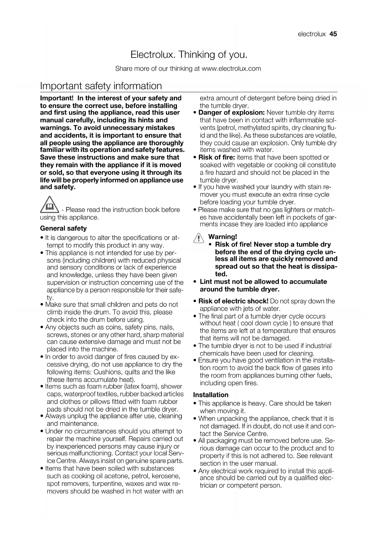 - Danger of explosion: Never tumble dry items that have been in contact with inflammable sol- vents (petrol, methylated spirits, dry cleaning flu- id and the like). As these substances are volatile, they could cause an explosion. Only tumble dry items washed with water.