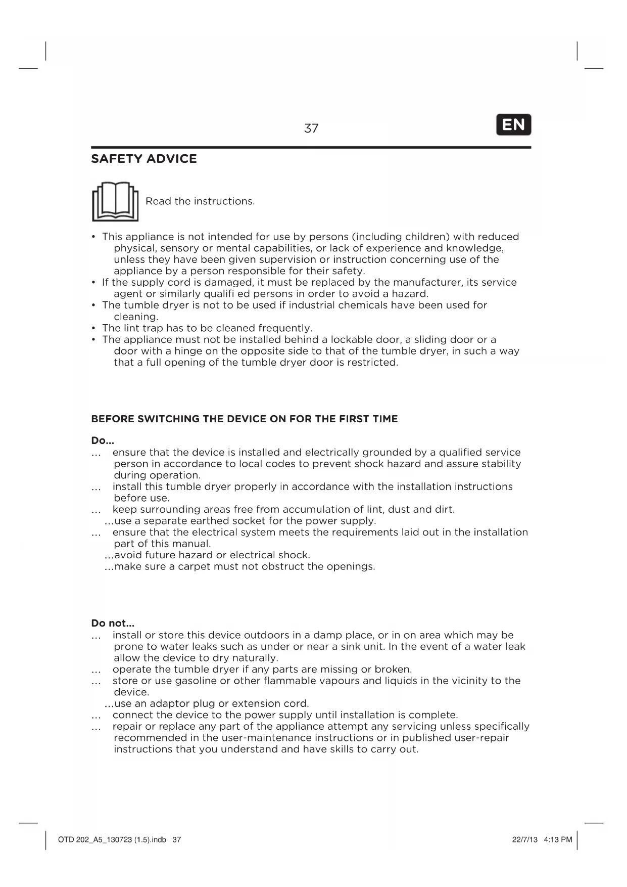 ... install this tumble dryer properly in accordance with the installation instructions before use.