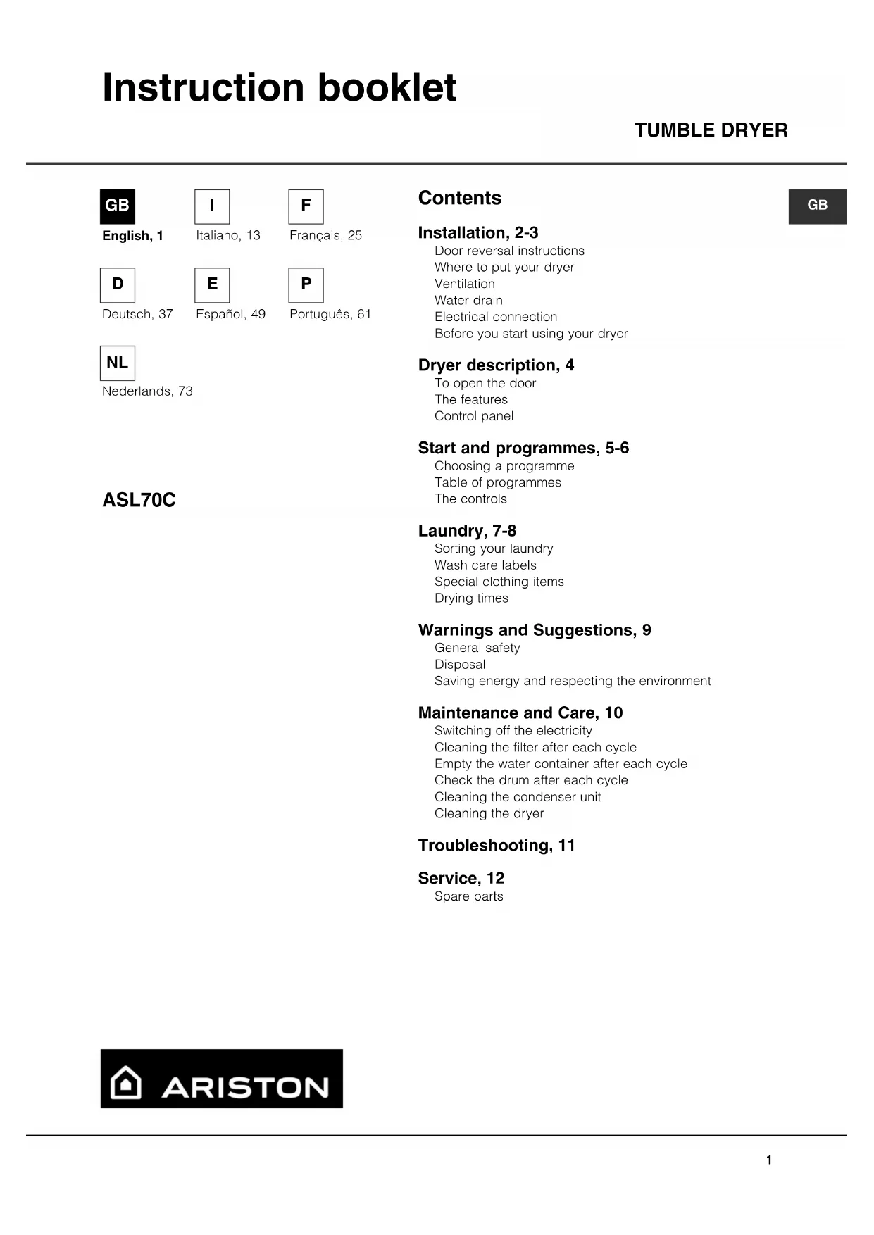 Contents TUMBLE DRYER ASL70C Instruction booklet Installation, 2-3 Door reversal instructions Where to put your dryer Ventilation Water drain Electrical connection Before you start using your dryer Dryer description, 4 To open the door The features Control panel Start and programmes, 5-6 Choosing a programme Table of programmes The controls Laundry, 7-8 Sorting your laundry Wash care labels Special clothing items Drying times Warnings and Suggestions, 9 General safety Disposal Saving energy and respecting the environment Maintenance and Care, 10 Switching off the electricity Cleaning the filter after each cycle Empty the water container after each cycle Check the drum after each cycle Cleaning the condenser unit Cleaning the dryer Troubleshooting, 11 Service, 12 Spare parts