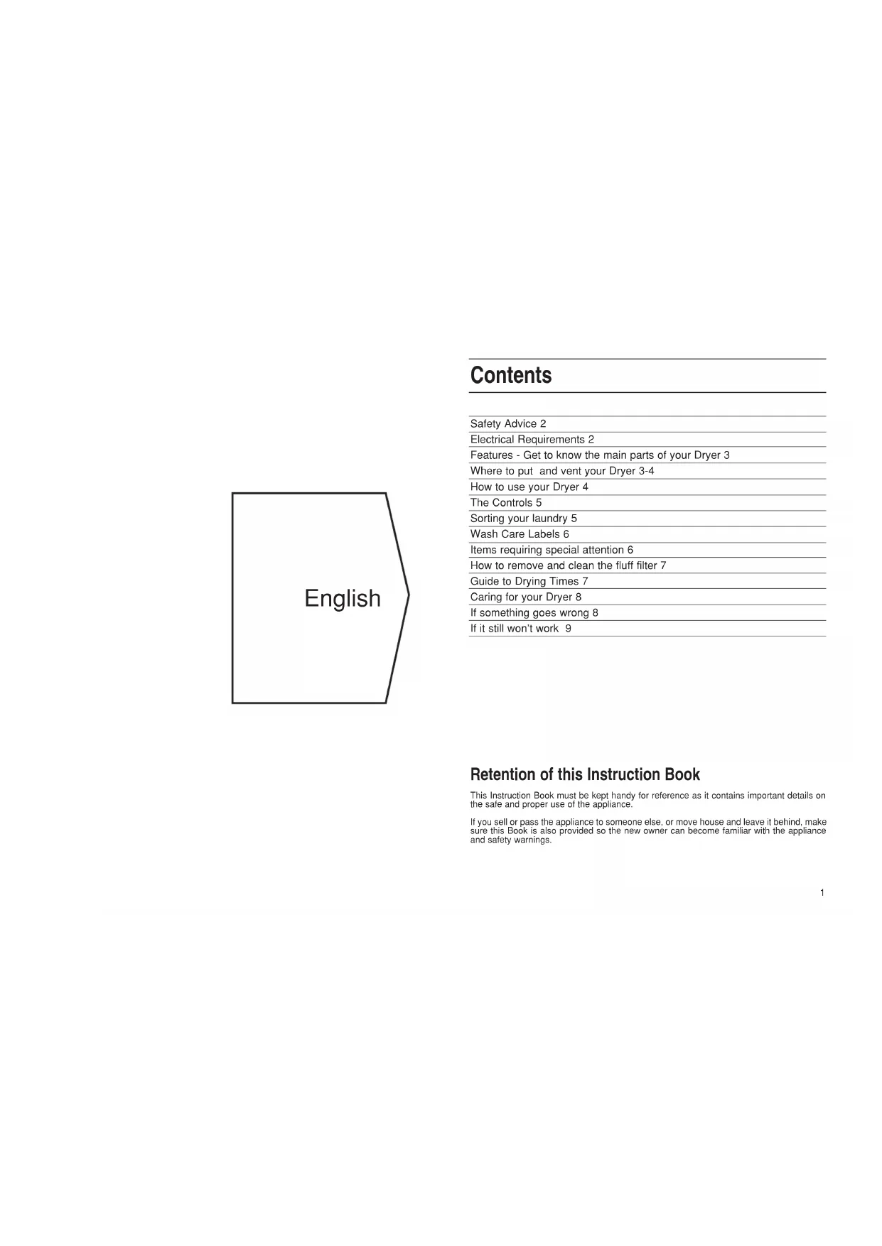 Instruções de Utilização, Conservação e Instalação A35VMerloni Elettrodomestici spa Via Aristide Merloni 47 60044 Fabriano (AN) Italy tel. +39 0732 6611 www.merloni.comEnglish Safety Advice 2 Electrical Requirements 2 Features - Get to know the main parts of your Dryer 3 Where to put and vent your Dryer 3-4 How to use your Dryer 4 The Controls 5 Sorting your laundry 5 Wash Care Labels 6 Items requiring special attention 6 How to remove and clean the fluff filter 7 Guide to Drying Times 7 Caring for your Dryer 8 If something goes wrong 8 If it still won’t work 9 Contents