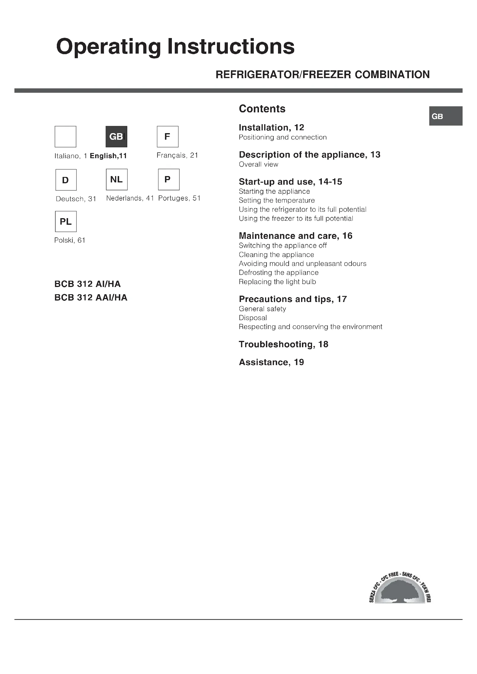 Contents Installation, 12 Positioning and connection Description of the appliance, 13 Overall view Start-up and use, 14-15 Starting the appliance Setting the temperature Using the refrigerator to its full potential Using the freezer to its full potential Maintenance and care, 16 Switching the appliance off Cleaning the appliance Avoiding mould and unpleasant odours Defrosting the appliance Replacing the light bulb Precautions and tips, 17 General safety Disposal Respecting and conserving the environment Troubleshooting, 18 Assistance, 19 Operating Instructions Italiano, 1 English,11 GBI