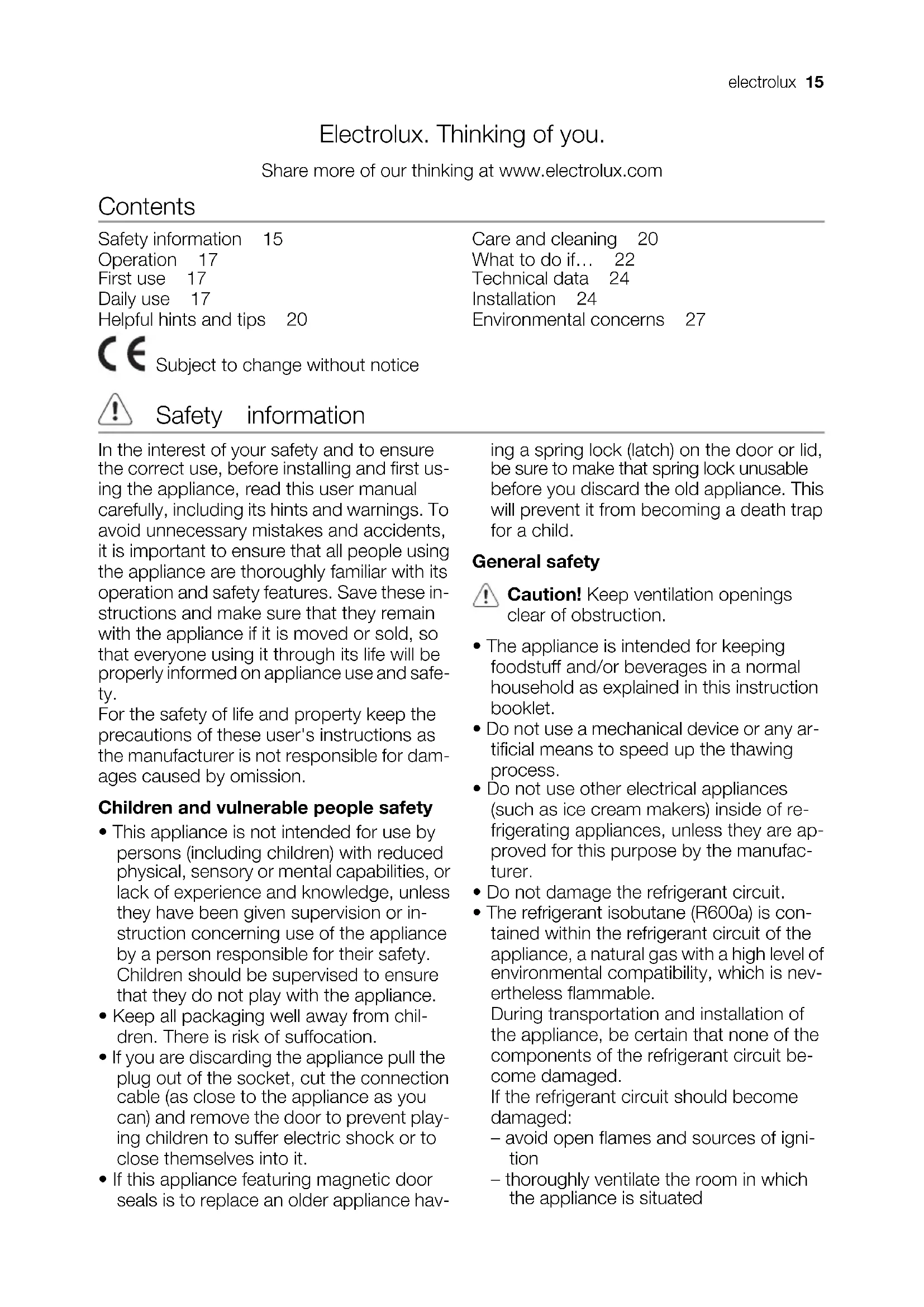 - The refrigerant isobutane (R600a) is con- tained within the refrigerant circuit of the appliance, a natural gas with a high level of environmental compatibility, which is nev- ertheless flammable. During transportation and installation of the appliance, be certain that none of the components of the refrigerant circuit be- come damaged. If the refrigerant circuit should become damaged: – avoid open flames and sources of igni- tion – thoroughly ventilate the room in which the appliance is situated electrolux 15• It is dangerous to alter the specifications or modify this product in any way. Any dam- age to the cord may cause a short-circuit, fire and/or electric shock. Warning! Any electrical component (power cord, plug, compressor) must be replaced by a certified service agent or qualified service personnel.