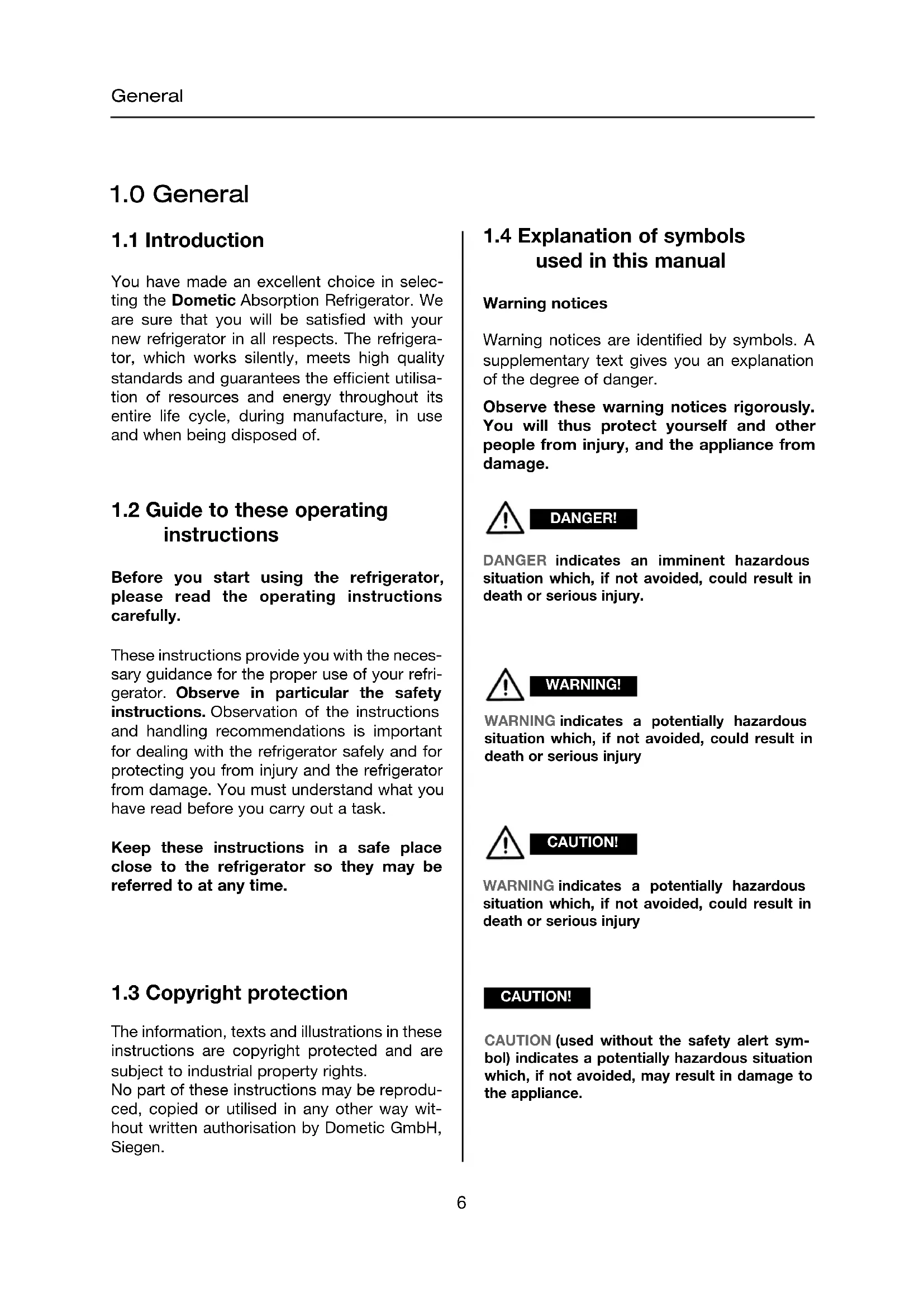 You have made an excellent choice in selec- ting the Dometic Absorption Refrigerator. We are sure that you will be satisfied with your new refrigerator in all respects. The refrigera- tor, which works silently, meets high quality standards and guarantees the efficient utilisa- tion of resources and energy throughout its entire life cycle, during manufacture, in use and when being disposed of.