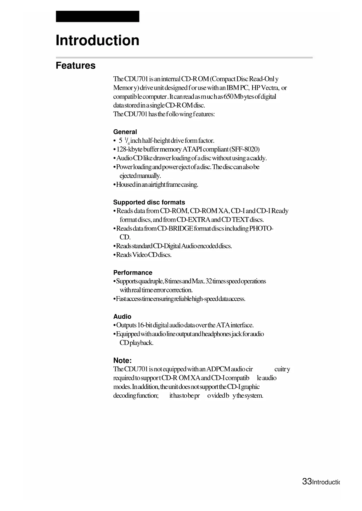 - Equipped with audio line output and headphones jack for audio CD playback. Note: The CDU701 is not equipped with an ADPCM audio cir cuitr y required to suppor t CD-R OM XA and CD-I compatib le audio modes. In addition, the unit does not support the CD-I graphic decoding function; it has to be pr o vided b y the system.34 Introduction Software Requirement To access data on CD-R OM discs, the appr opriate de vice driver and MSCDEX (supplied with the host adapter) must be installed in your computer when the OS is MS-DOS/Windo ws 3.1. See the man ual that comes with the host adapter for details. The application software y ou need f or using the data on a CD-R OM disc depends on the type and f ormat of the tar g et data. See the man ual supplied with y our CD-R OM disc f or instructions. Example of System Setup To use the CD-R OM drive unit, the f ollo wing components are required: