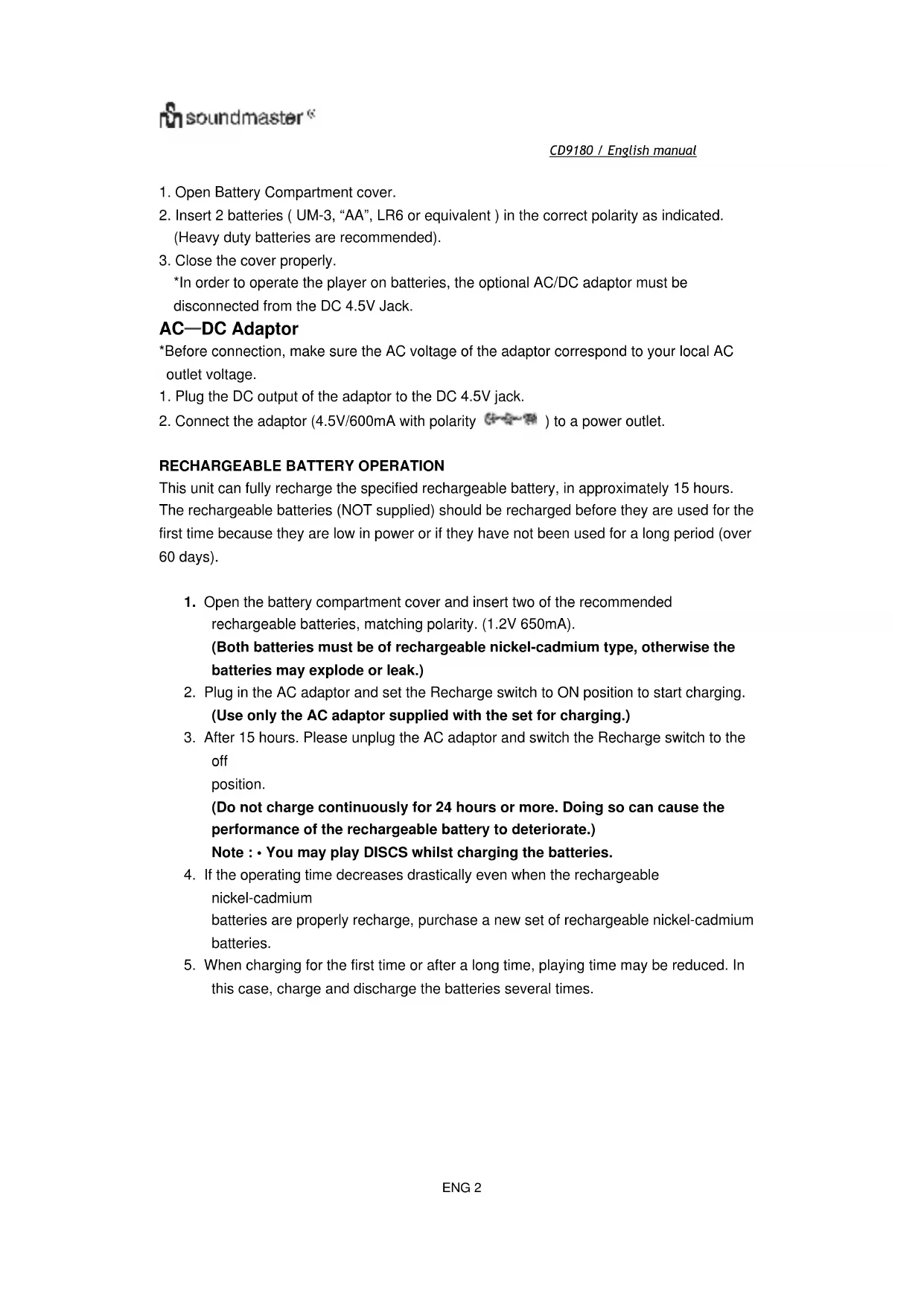 Download the instructions for your Cd player/recorder in PDF format for free! Find your manual CD9180 - Soundmaster and take your electronic device back in hand. On this page are published all the documents necessary for the use of your device. CD9180 by Soundmaster.