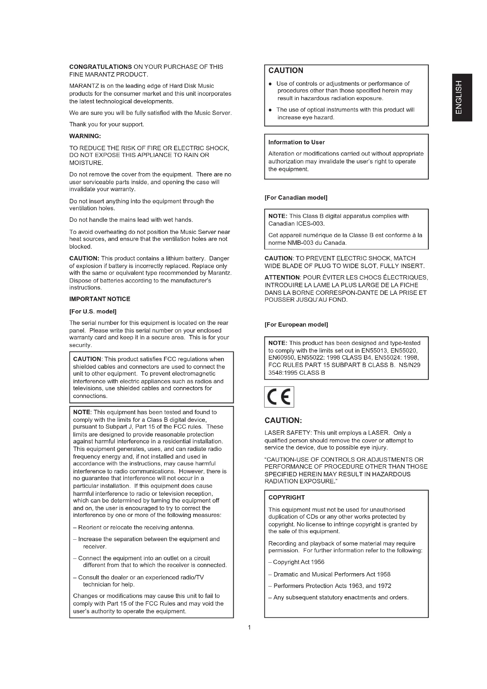 TO REDUCE THE RISK OF FIRE OR ELECTRIC SHOCK, DO NOT EXPOSE THIS APPLIANCE TO RAIN OR MOISTURE. Do not remove the cover from the equipment. There are no user serviceable parts inside, and opening the case will invalidate your warranty. Do not insert anything into the equipment through the ventilation holes. Do not handle the mains lead with wet hands. To avoid overheating do not position the Music Server near heat sources, and ensure that the ventilation holes are not blocked. CAUTION: This product contains a lithium battery. Danger of explosion if battery is incorrectly replaced. Replace only with the same or equivalent type recommended by Marantz. Dispose of batteries according to the manufacturer’s instructions. IMPORTANT NOTICE [For U.S. model] The serial number for this equipment is located on the rear panel. Please write this serial number on your enclosed warranty card and keep it in a secure area. This is for your security. CAUTION: This product satisfies FCC regulations when shielded cables and connectors are used to connect the unit to other equipment. To prevent electromagnetic interference with electric appliances such as radios and televisions, use shielded cables and connectors for connections. NOTE: This equipment has been tested and found to comply with the limits for a Class B digital device, pursuant to Subpart J, Part 15 of the FCC rules. These limits are designed to provide reasonable protection against harmful interference in a residential installation. This equipment generates, uses, and can radiate radio frequency energy and, if not installed and used in accordance with the instructions, may cause harmful interference to radio communications. However, there is no guarantee that interference will not occur in a particular installation. If this equipment does cause harmful interference to radio or television reception, which can be determined by turning the equipment off and on, the user is encouraged to try to correct the interference by one or more of the following measures: – Reorient or relocate the receiving antenna. – Increase the separation between the equipment and receiver. – Connect the equipment into an outlet on a circuit different from that to which the receiver is connected. – Consult the dealer or an experienced radio/TV technician for help. Changes or modifications may cause this unit to fail to comply with Part 15 of the FCC Rules and may void the user’s authority to operate the equipment. CAUTION z Use of controls or adjustments or performance of procedures other than those specified herein may result in hazardous radiation exposure. z The use of optical instruments with this product will increase eye hazard. Information to User Alteration or modifications carried out without appropriate authorization may invalidate the user’s right to operate the equipment. [For Canadian model] NOTE: This Class B digital apparatus complies with Canadian ICES-003. Cet appareil numérique de la Classe B est conforme à la norme NMB-003 du Canada.