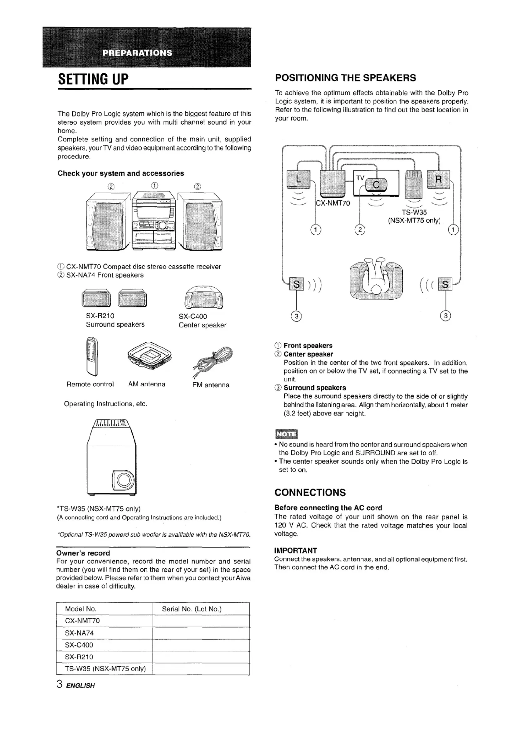 GENERAL CARE AND MAINTENANcE .......................................... 24 TROUBLESHOOTING GUIDE ....................................... . 24 SPECIFICATIONS ........... ................................ ........... 25 PARTS INDEX ................................................... Back cover ENGLISH 2SETTING UP The Dolby Pro Logic system which is the biggest feature of this stereo system provides you with multi channel sound in your home, Complete setting and connection of the main unit, supplied speakers, your TV and video equipment according to the following procedure. Check your system and accessories @ CX-NMT70 Compact disc stereo cassette receiver @ SX-NA74 Front speakers SX-R21 OSX-C400Surround speakersCenter speakerRemote controlAM antennaFM antennaOperating Instructions, etc. I!c) *TS-W35 (NSX-MT75 only) (A connecting cord and Operating Instructions are included.) ‘Optional TS- W35 powerd sub woofer k available with the NSX-MT70. Owner’s record For your convenience, record the model number and serial number (you will find them on the rear of your set) in the space provided below. Please refer to them when you contact your Aiwa dealer in case of difficulty. Model No, Serial No. (Lot No.)