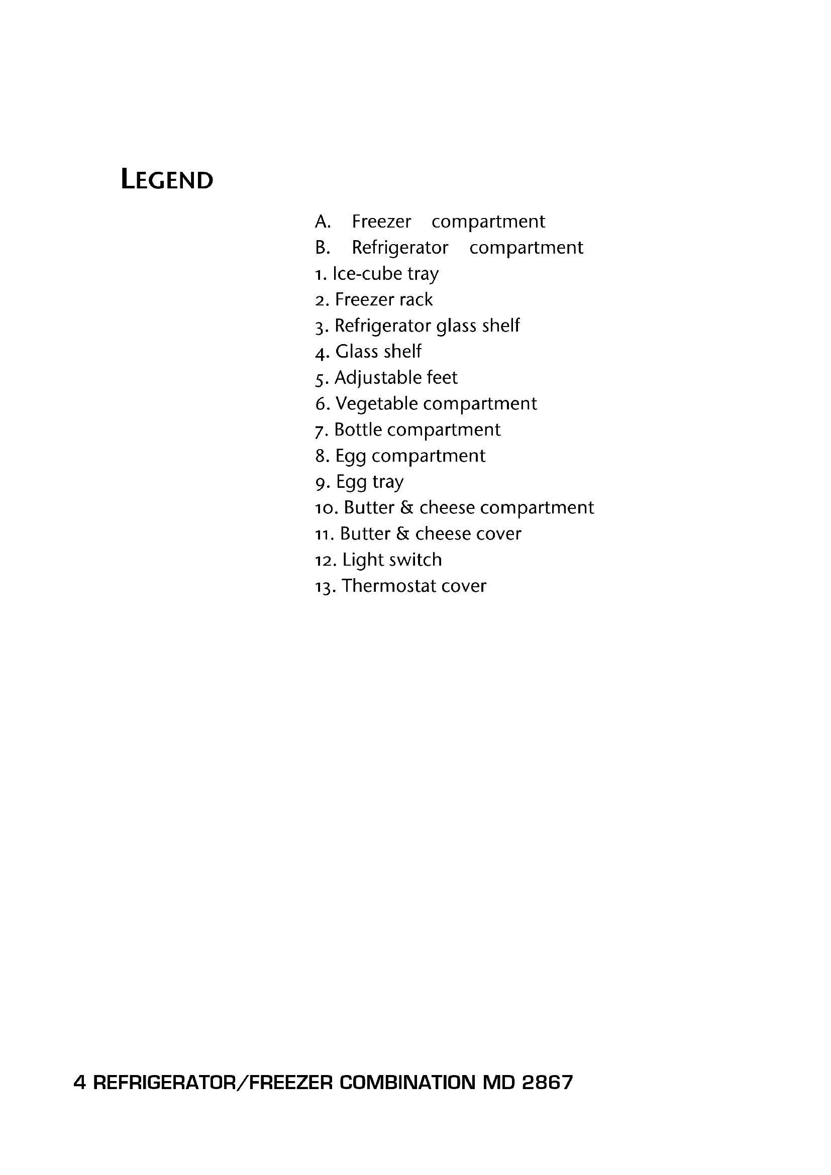 SPECIFICATIONS Voltage supply: 230V~50Hz Average power consumption: 0,79 kWh / 24 h Capacity: 187l freezer compartment, 48l refrigerator compartment Ambient temperature: 16 - 32 °C Light bulb: E14/15W The unit is fitted with interference suppression according to EU Guideline 87/308/EEC. It complies with the accident prevention regulations applicable to refrigeration units (German Federal law VBG 20). Subject to technical modifications!30 REFRIGERATOR/FREEZER COMBINATION MD 2867F-3