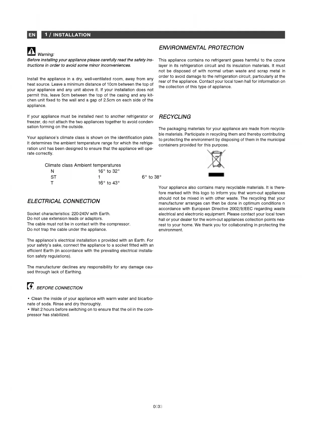 - Wait 2 hours before switching on to ensure that the oil in the com- pressor has stabilized. RREECCYYCCLLIINNGG The packaging materials for your appliance are made from recycla- ble materials. Participate in recycling them and thereby contributing to protecting the environment by disposing of them in the municipal containers provided for this purpose. Your appliance also contains many recyclable materials. It is there- fore marked with this logo to inform you that worn-out appliances should not be mixed in with other waste. The recycling that your manufacturer arranges can then be done in optimum conditions n accordance with European Directive 2002/9/EEC regarding waste electrical and electronic equipment. Please contact your local town hall or your dealer for the worn-out appliances collection points nea- rest to your home. We thank you for collaborating in protecting the environment.
