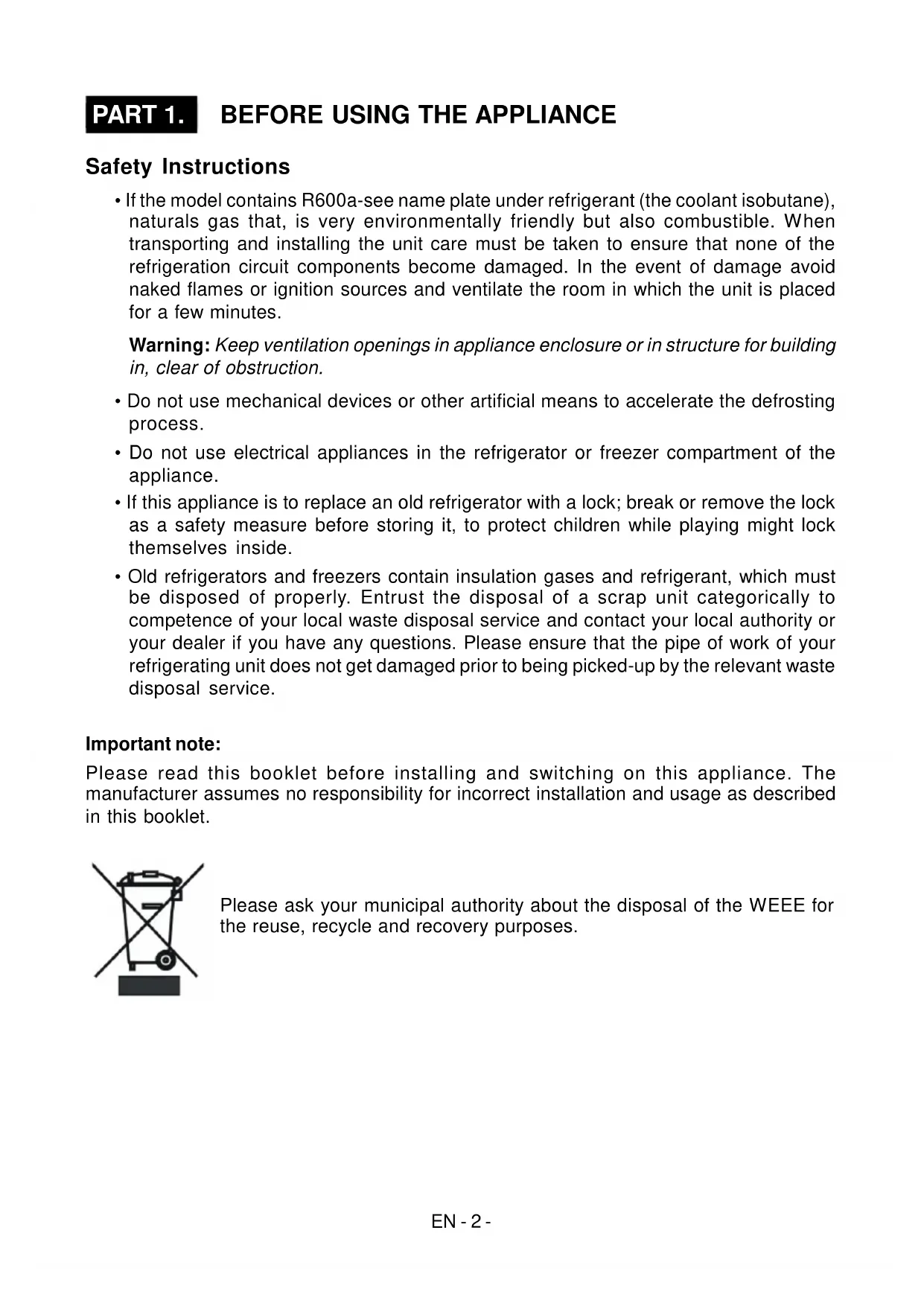 - Old refrigerators and freezers contain insulation gases and refrigerant, which must be disposed of properly. Entrust the disposal of a scrap unit categorically to competence of your local waste disposal service and contact your local authority or your dealer if you have any questions. Please ensure that the pipe of work of your refrigerating unit does not get damaged prior to being picked-up by the relevant waste disposal service. Important note: Please read this booklet before installing and switching on this appliance. The manufacturer assumes no responsibility for incorrect installation and usage as described in this booklet. Please ask your municipal authority about the disposal of the WEEE for the reuse, recycle and recovery purposes.EN - 3 - Recommendations