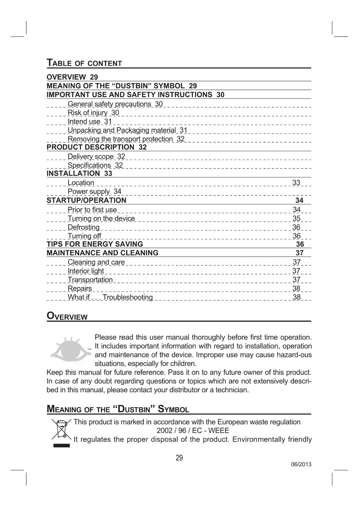 vervieW Please read this user manual thoroughly before rst time operation. It includes important information with regard to installation, operation and maintenance of the device. Improper use may cause hazard-ous situations, especially for children. Keep this manual for future reference. Pass it on to any future owner of this product. In case of any doubt regarding questions or topics which are not extensively descri- bed in this manual, please contact your distributor or a technician. MeaninG OF the “DUstBin” sYMBOl This product is marked in accordance with the European waste regulation