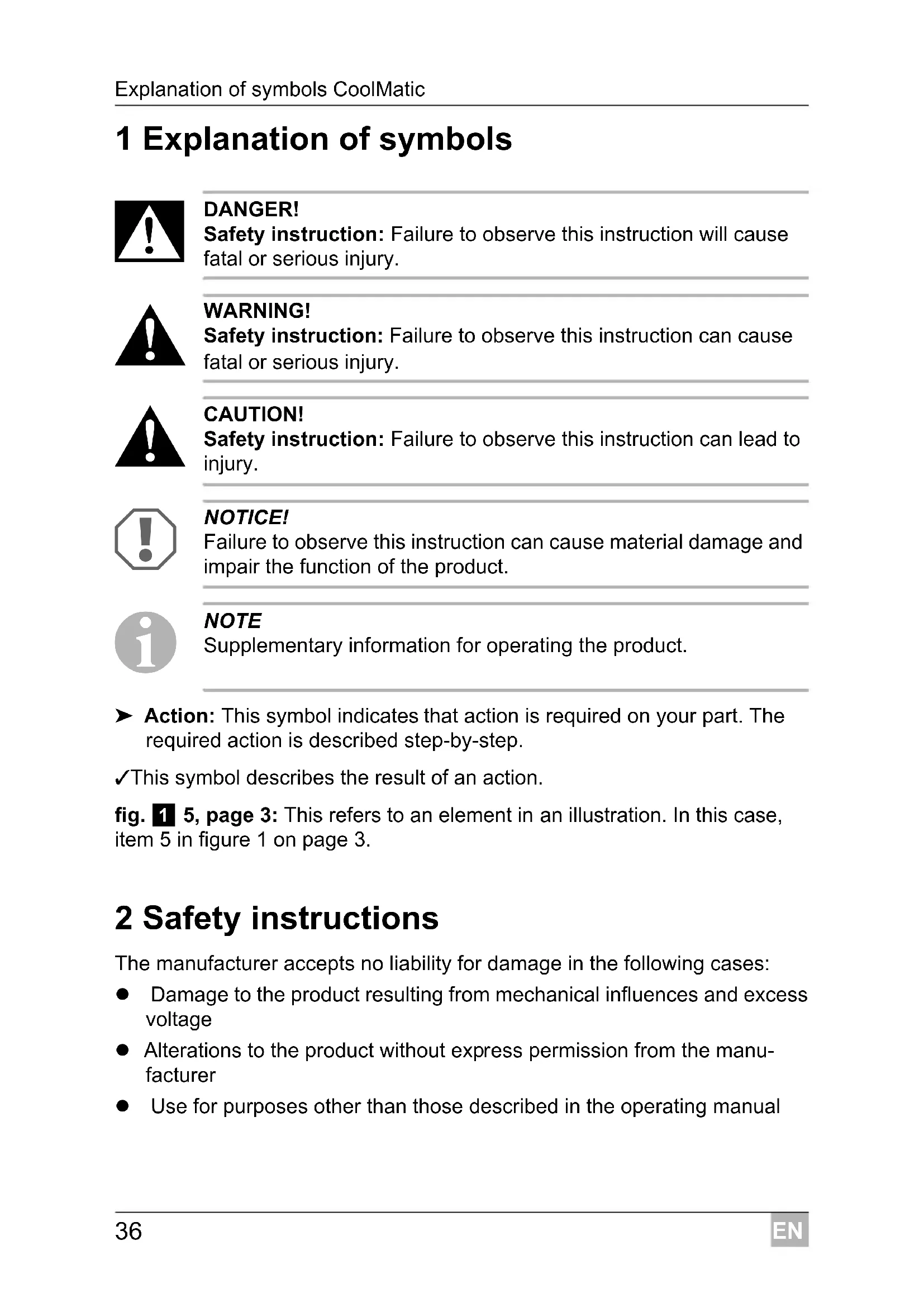 NOTE Supplementary information for operating the product. ➤ Action: This symbol indicates that action is required on your part. The required action is described step-by-step. ✓ This symbol describes the result of an action. fig. 1 5, page 3: This refers to an element in an illustration. In this case, item 5 in figure 1 on page 3. 2 Safety instructions The manufacturer accepts no liability for damage in the following cases: Damage to the product resulting from mechanical influences and excess voltage Alterations to the product without express permission from the manu- facturer Use for purposes other than those described in the operating manualEN CoolMatic Safety instructions