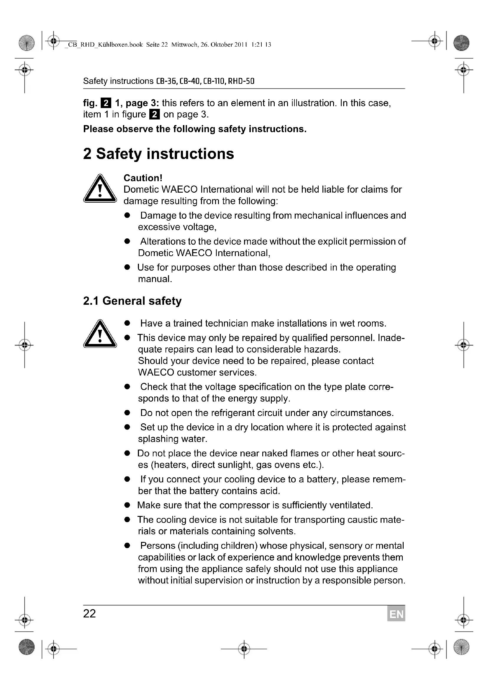 Note Supplementary information for operating the device. ➤ Action: this symbol indicates that action is required on your part. The required action is described step-by-step. ✓ This symbol indicates the result of an action. _CB_RHD_Kühlboxen.book Seite 21 Mittwoch, 26. Oktober 2011 1:21 13EN Safety instructions CB-36, CB-40, CB-110, RHD-50