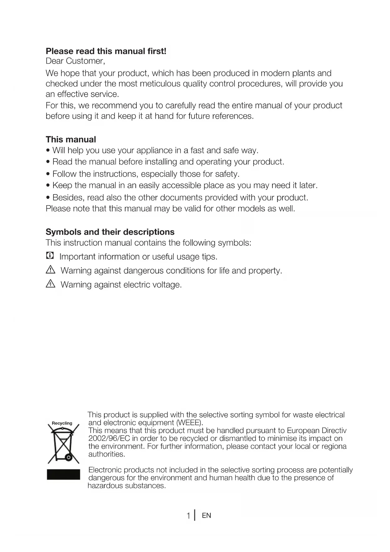 - Besides, read also the other documents provided with your product. Please note that this manual may be valid for other models as well. Symbols and their descriptions This instruction manual contains the following symbols: C Important information or useful usage tips. A Warning against dangerous conditions for life and property. B Warning against electric voltage. This product is supplied with the selective sorting symbol for waste electrical and electronic equipment (WEEE). This means that this product must be handled pursuant to European Directive 2002/96/EC in order to be recycled or dismantled to minimise its impact on the environment. For further information, please contact your local or regional authorities. Electronic products not included in the selective sorting process are potentially dangerous for the environment and human health due to the presence of hazardous substances. Recycling2