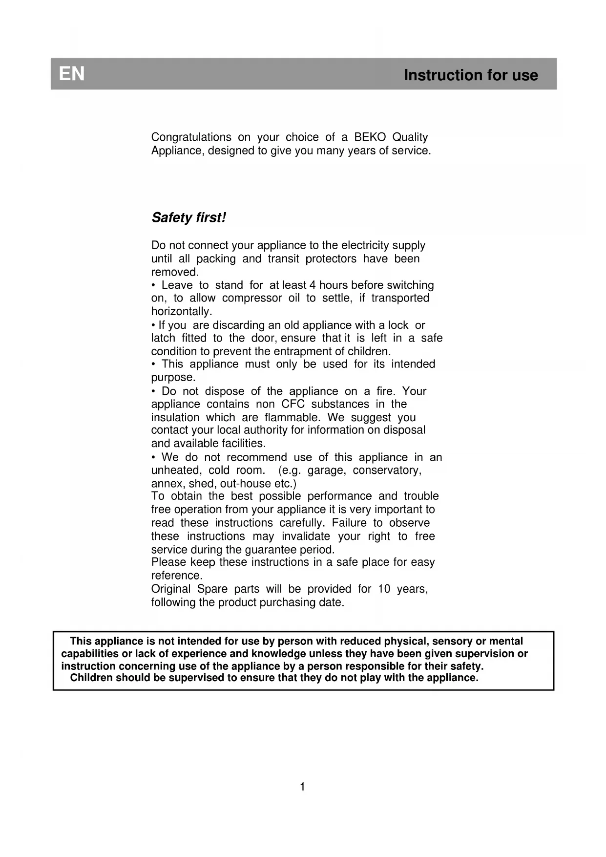 - We do not recommend use of this appliance in an unheated, cold room. (e.g. garage, conservatory, annex, shed, out-house etc.) To obtain the best possible performance and trouble free operation from your appliance it is very important to read these instructions carefully. Failure to observe these instructions may invalidate your right to free service during the guarantee period. Please keep these instructions in a safe place for easy reference. Original Spare parts will be provided for 10 years, following the product purchasing date.