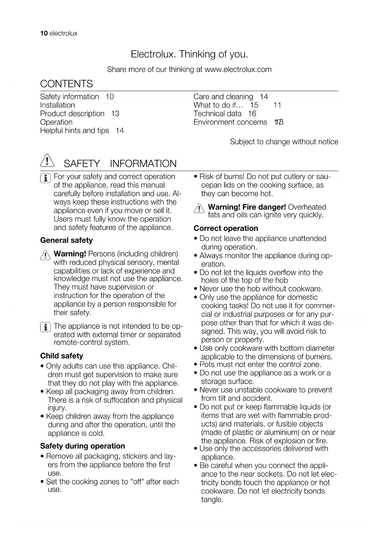 - Risk of burns! Do not put cutlery or sau- cepan lids on the cooking surface, as they can become hot. Warning! Fire danger! Overheated fats and oils can ignite very quickly. Correct operation