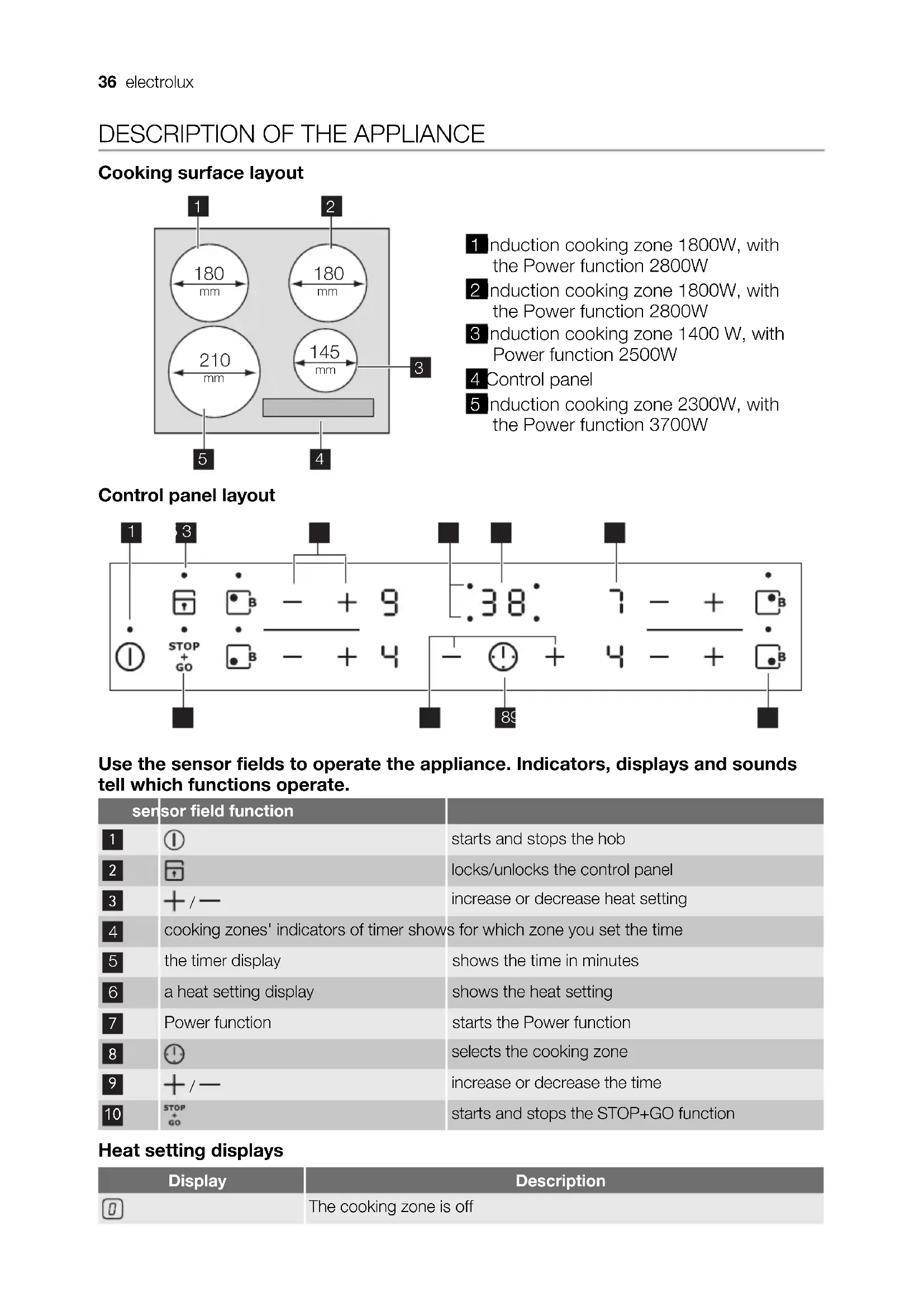 starts and stops the STOP+GO function Heat setting displays Display Description The cooking zone is off 36 electroluxDisplay Description Keep warm/STOP+GO function is active