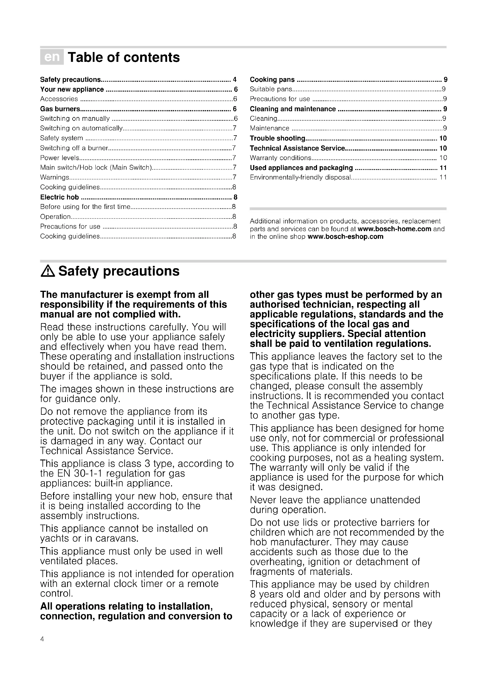 - Environmentally-friendly disposal Produktinfo Additional information on products, accessories, replacement parts and services can be found at www.bosch-home.com and in the online shop www.bosch-eshop.com : Safety precautions The manufacturer is exempt from all responsibility if the requirements of this manual are not complied with. Read these instructions carefully. You will only be able to use your appliance safely and effectively when you have read them. These operating and installation instructions should be retained, and passed onto the buyer if the appliance is sold. The images shown in these instructions are for guidance only. Do not remove the appliance from its protective packaging until it is installed in the unit. Do not switch on the appliance if it is damaged in any way. Contact our Technical Assistance Service. This appliance is class 3 type, according to the EN 30-1-1 regulation for gas appliances: built-in appliance. Before installing your new hob, ensure that it is being installed according to the assembly instructions. This appliance cannot be installed on yachts or in caravans. This appliance must only be used in well ventilated places. This appliance is not intended for operation with an external clock timer or a remote control. All operations relating to installation, connection, regulation and conversion to other gas types must be performed by an authorised technician, respecting all applicable regulations, standards and the specifications of the local gas and electricity suppliers. Special attention shall be paid to ventilation regulations. This appliance leaves the factory set to the gas type that is indicated on the specifications plate. If this needs to be changed, please consult the assembly instructions. It is recommended you contact the Technical Assistance Service to change to another gas type. This appliance has been designed for home use only, not for commercial or professional use. This appliance is only intended for cooking purposes, not as a heating system. The warranty will only be valid if the appliance is used for the purpose for which it was designed. Never leave the appliance unattended during operation. Do not use lids or protective barriers for children which are not recommended by the hob manufacturer. They may cause accidents such as those due to the overheating, ignition or detachment of fragments of materials. This appliance may be used by children 8 years old and older and by persons with reduced physical, sensory or mental capacity or a lack of experience or knowledge if they are supervised or they5 have been instructed about the safe use of the appliance and have understood the associated dangers. Never let children play with the appliance. Cleaning and user maintenance must not be carried out by unsupervised children. Risk of deflagration! Accumulation of unburned gas in an enclosed area carries a risk of deflagration. Do not subject the appliance to draughts. These might blow out the burners. Carefully read the instructions and warnings on the operation of gas burners. Risk of poisoning! The kitchen will become hot and humid and combustion products produced when this gas appliance is used. Make sure the kitchen is well ventilated, particularly when the hob is in operation: either keep the natural ventilation apertures open, or install a ventilation system (extractor hood). Intense prolonged use of the appliance may require additional or more effective ventilation: open a window or increase the power of the ventilation system. Risk of burns! The hotplates and their immediate vicinity get very hot. Never touch the hot surfaces. Keep children under 8 years old well away from this appliance. Risk of fire! p. 11