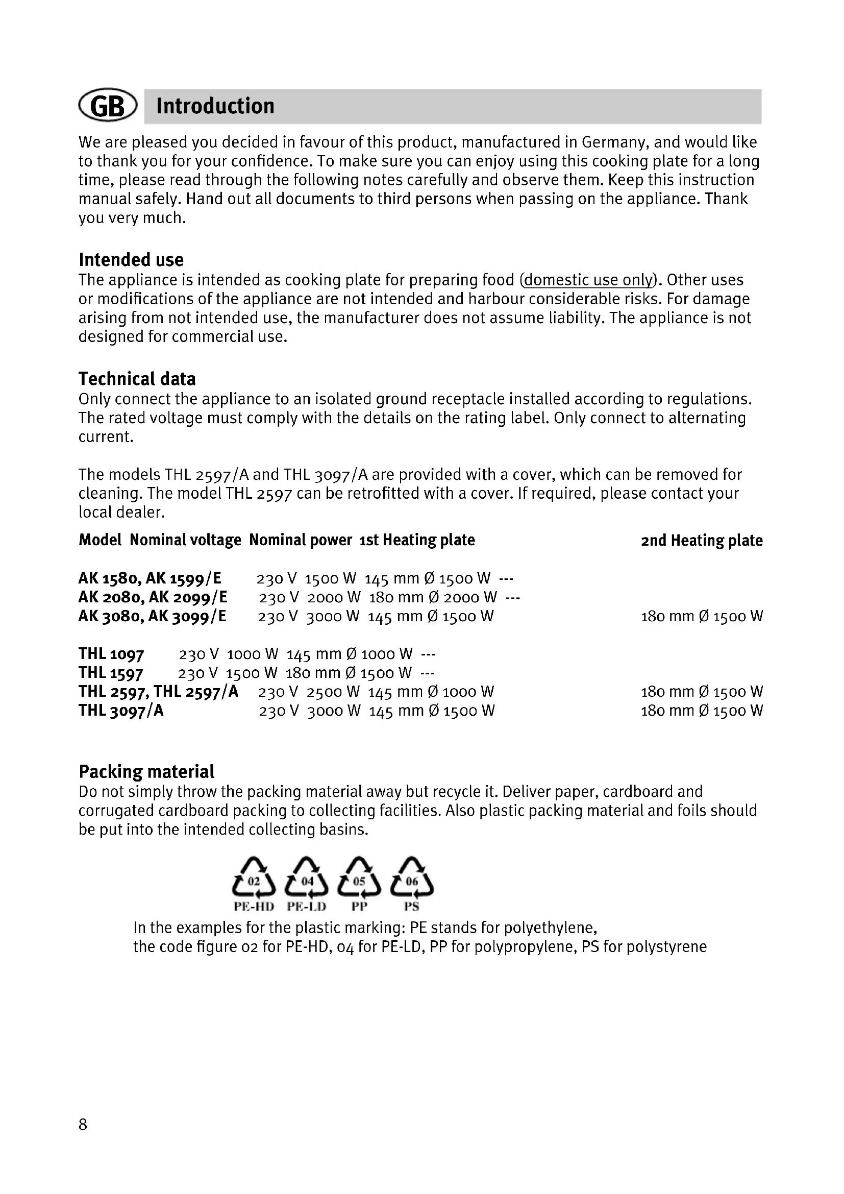 Wh/kg 195 Wh/kg8 We are pleased you decided in favour of this product, manufactured in Germany, and would like to thank you for your confidence. To make sure you can enjoy using this cooking plate for a long time, please read through the following notes carefully and observe them. Keep this instruction manual safely. Hand out all documents to third persons when passing on the appliance. Thank you very much. Intended use The appliance is intended as cooking plate for preparing food (domestic use only). Other uses or modifications of the appliance are not intended and harbour considerable risks. For damage arising from not intended use, the manufacturer does not assume liability. The appliance is not designed for commercial use. Technical data Only connect the appliance to an isolated ground receptacle installed according to regulations. The rated voltage must comply with the details on the rating label. Only connect to alternating current. The models THL 2597/A and THL 3097/A are provided with a cover, which can be removed for cleaning. The model THL 2597 can be retrofitted with a cover. If required, please contact your local dealer. Model Nominal voltage Nominal power 1st Heating plate 2nd Heating plate AK 1580, AK 1599/E 230 V 1500 W 145 mm Ø 1500 W --- AK 2080, AK 2099/E 230 V 2000 W 180 mm Ø 2000 W --- AK 3080, AK 3099/E 230 V 3000 W 145 mm Ø 1500 W 180 mm Ø 1500 W THL 1097 230 V 1000 W 145 mm Ø 1000 W --- THL 1597 230 V 1500 W 180 mm Ø 1500 W ---