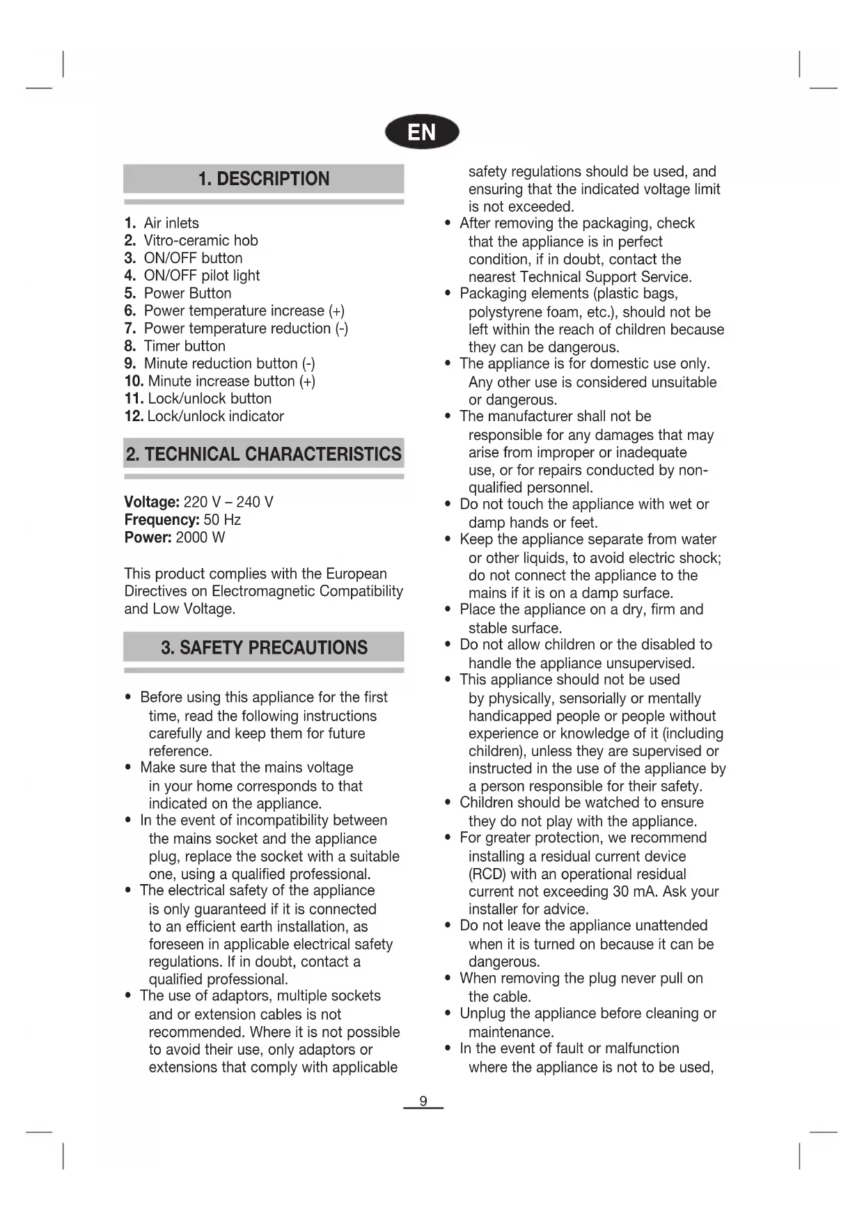 Voltage: 220 V – 240 V Frequency: 50 Hz Power: 2000 W This product complies with the European Directives on Electromagnetic Compatibility and Low Voltage.10 turn off the appliance and do not attempt to repair. If a repair is required, contact a Technical Assistance Service authorised by the manufacturer and request the use of original spare parts.