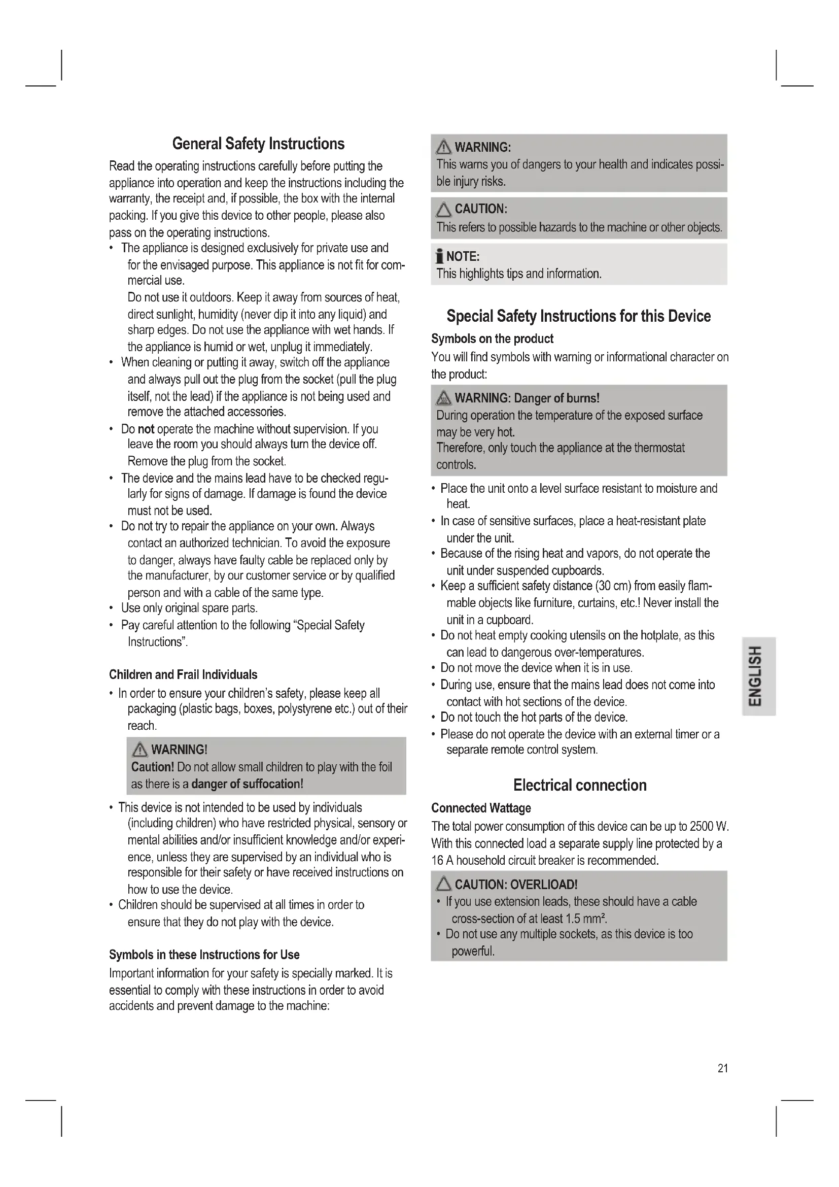 - Please do not operate the device with an external timer or a separate remote control system. Electrical connection Connected Wattage The total power consumption of this device can be up to 2500 W. With this connected load a separate supply line protected by a 16 A household circuit breaker is recommended. CAUTION: OVERLlOAD!