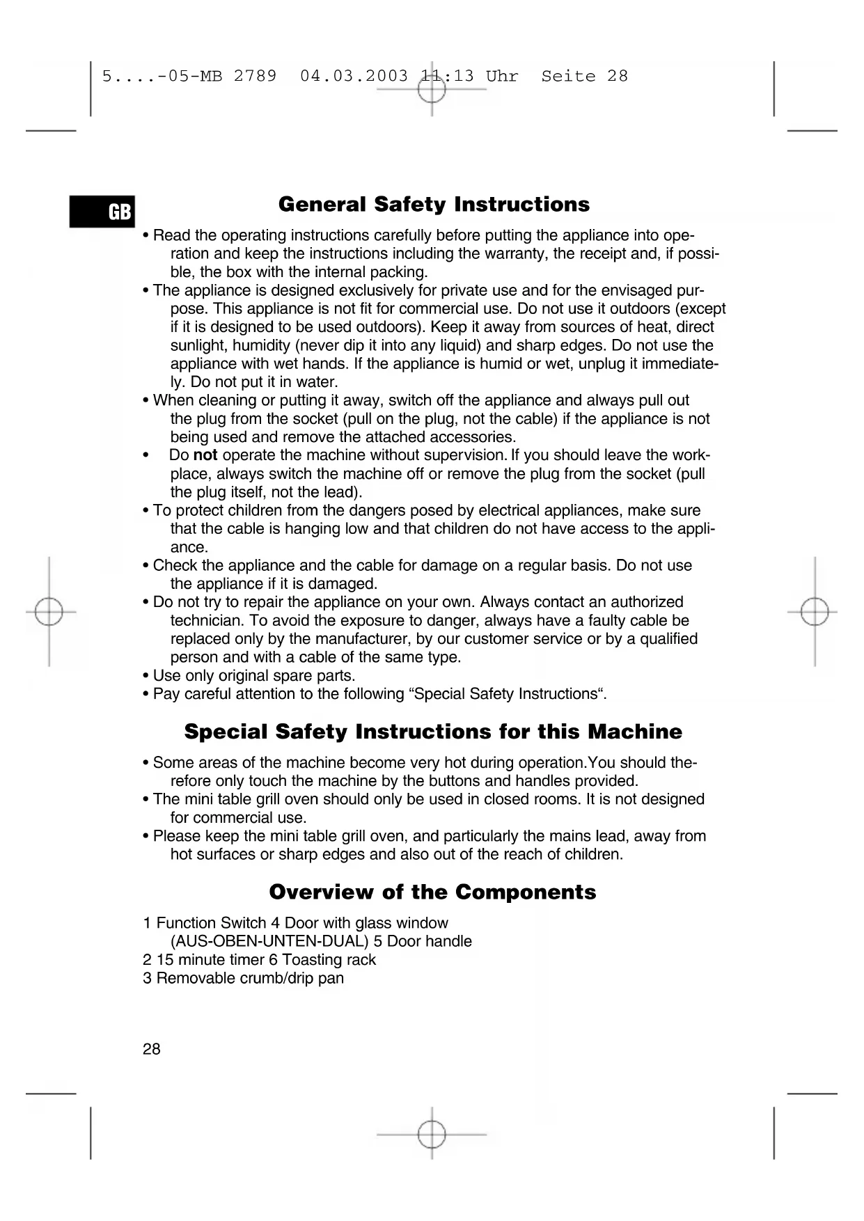 - Please keep the mini table grill oven, and particularly the mains lead, away from hot surfaces or sharp edges and also out of the reach of children. Overview of the Components 1 Function Switch 4 Door with glass window (AUS-OBEN-UNTEN-DUAL) 5 Door handle 2 15 minute timer 6 Toasting rack 3 Removable crumb/drip pan
